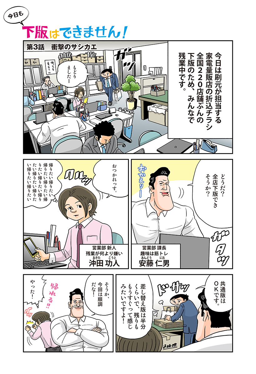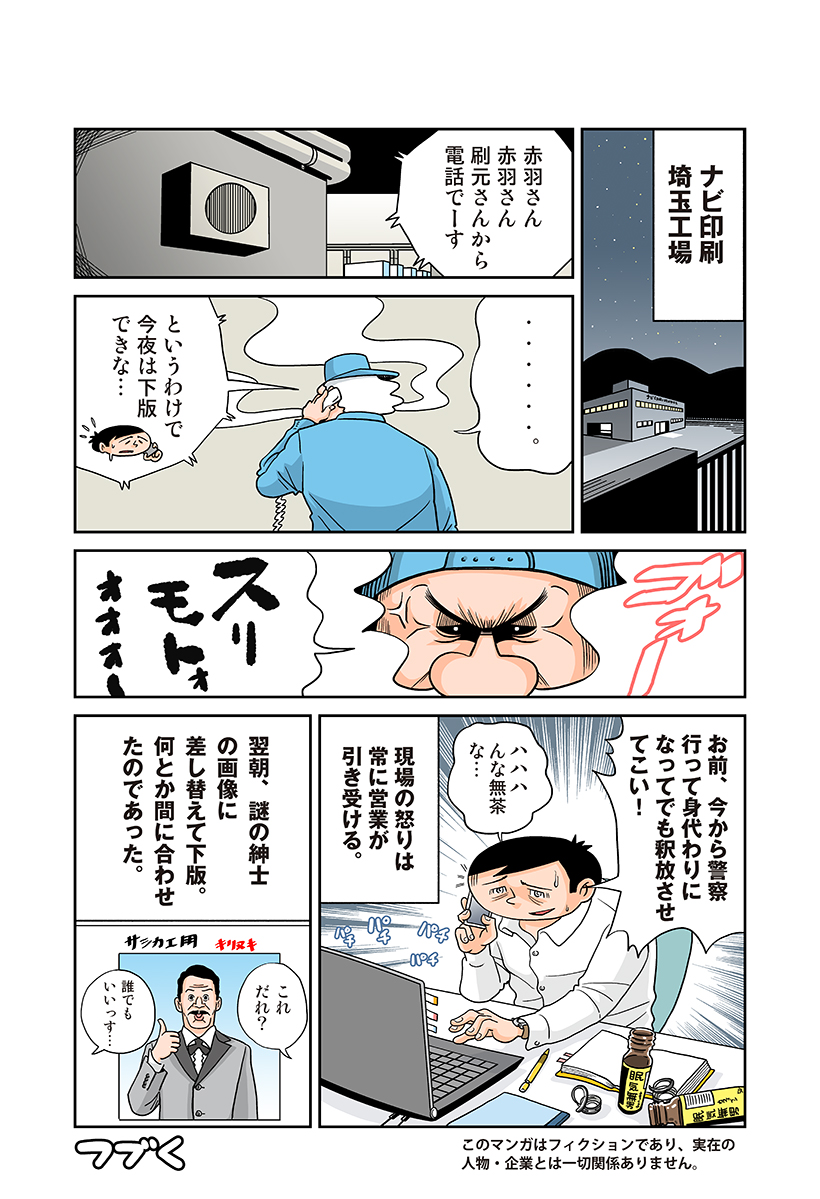 知られざる「印刷業界」の裏側をテーマにしたマンガ「今日も下版はできません! 」。ナビ印刷株式会社の営業マン・刷元 正(スリモト・タダシ)が印刷業界にまつわる「あるある」を、涙あり、「なるほど」や「へぇ~」ありでお届けします。著者のBOMANGAさんは、かつて印刷会社で営業を勤めていて、そのあたりの描写は超リアル。
