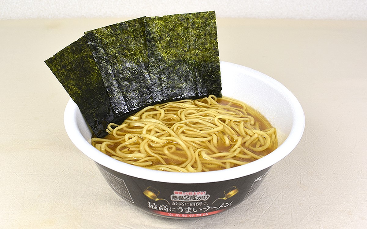 「普通のカップ麺より面倒…」と感じてしまうものの、温まった麺に再びお湯を注いだおかげでいつも以上に湯気の立つカップ麺が完成。調理方法にこだわる一方、“焼きのりオンリー”のシンプルすぎる具材にも驚かされます。さっそく麺を一口いただいたところ、思いのほかスープが絡んできて豚骨醤油の濃厚な風味が大爆発。旨みだしを効かせた味わいはさすがの一言で、「最高にうまい」というフレーズに文句のつけようがありません。