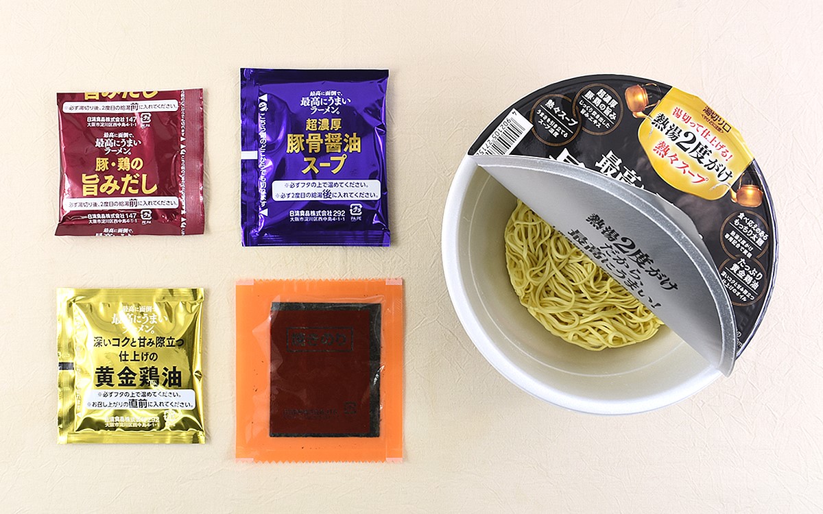 パッケージを開封すると、中には乾燥麺の他に「豚・鶏の旨みだし」や「超濃厚豚骨醤油スープ」など4つの小袋が。それらを加えていくのは確かに手間とはいえ、「面倒」と名づけるほどではないような気がしますよね。じつは同商品、1度湯切りして再度お湯を注ぐ“熱湯2度がけ”がポイント。さらに小袋を投入するタイミングがそれぞれ異なっているのも大きな特徴です。