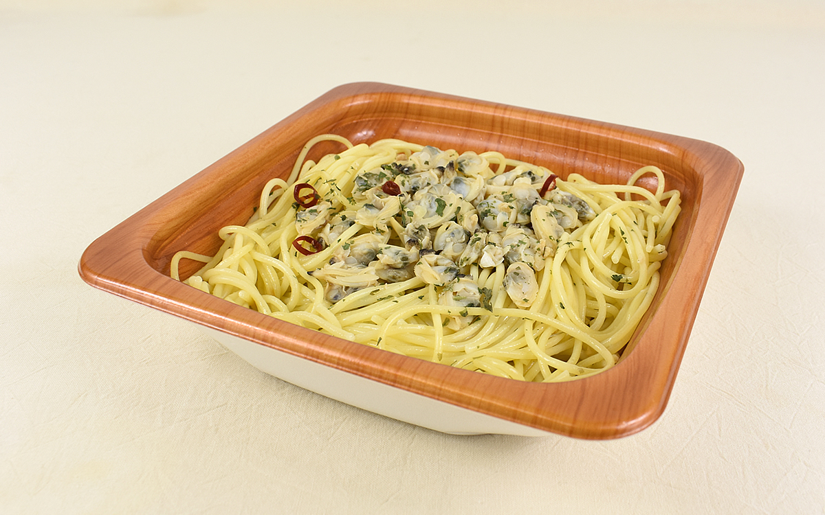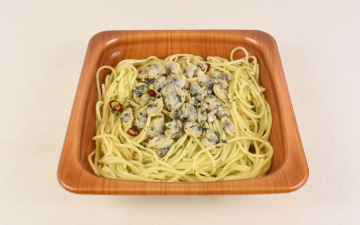 “ボンゴレ”とは、あさりなど二枚貝を使用したイタリアのパスタ料理のこと。また白ワインをベースにしたものをボンゴレビアンコ、トマトソースベースをボンゴレロッソと呼びます。ちなみに「あさりの旨みが広がる ボンゴレスパゲティ」は魚介ソースベース。あさりだけでなく、炒めたにんにくが加えられているのも特徴です。