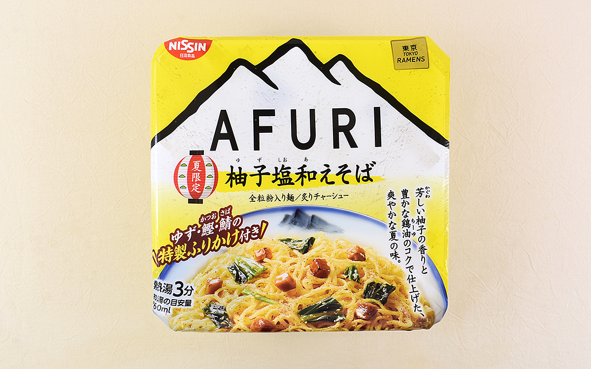 商品名に含まれる「AFURI」とは、2003年に創業した東京の人気ラーメン店のこと。神奈川県・丹沢にそびえる大山(通称 阿夫利山)の天然水を使用し、鶏ベースの黄金色スープが目を引く“淡麗系ラーメン”として知られています。ちなみに日清とタッグを組んだ「AFURI」シリーズは2015年から展開。今回選んだ柚子塩和えそばは、AFURIで一番人気のメニュー・柚子塩らーめんを“汁なし”にアレンジしたオリジナル商品です。