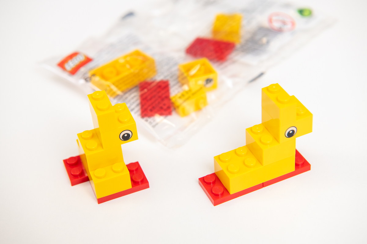 私たちがチャレンジしたのはレゴ ブロック6個だけを使用して、一人一つずつアヒルを作ること。しかも組み立て説明書がなく時間は1分で! 1分と聞くと深く考える時間はなく、直感的に組み立てました。完成したモノを見ると、筆者と担当編集が作ったアヒルはアヒルと呼べる見た目ではありませんでした……(笑)。しかし、子どもと遊び感覚で触っていたレゴに、このような教育的な使い方があることに驚きました。