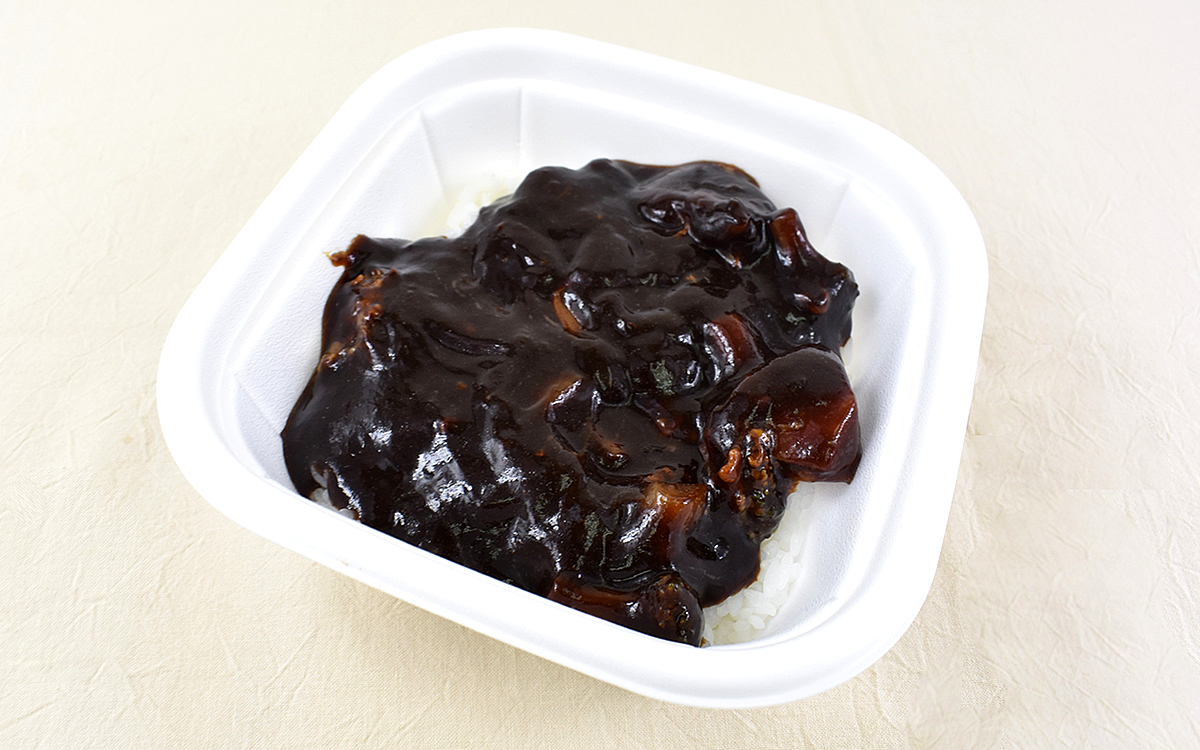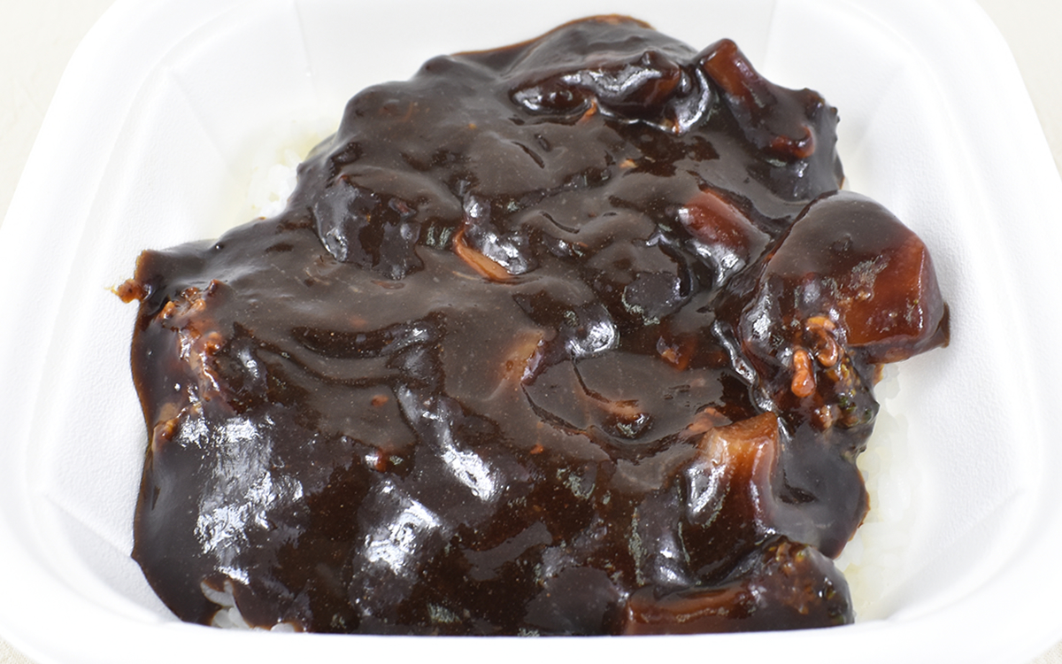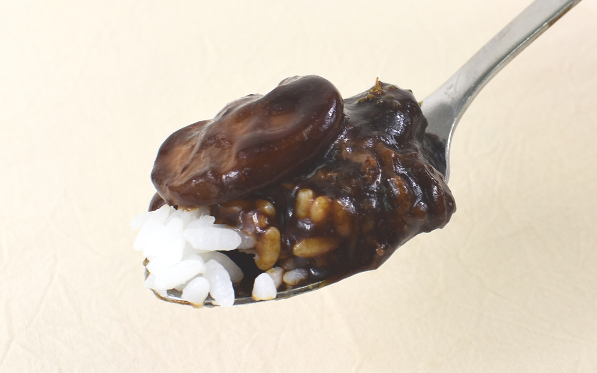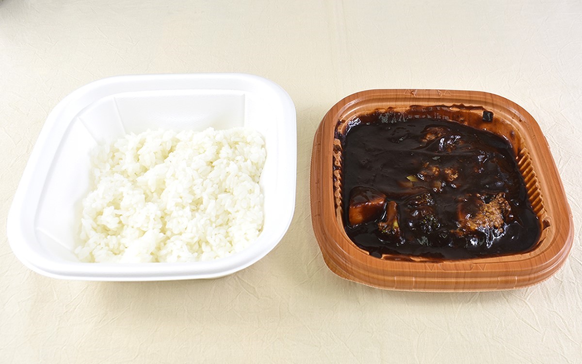 レシピによって赤みが強かったり茶色っぽかったりと、色味も大きく変わるのがハヤシライスの特徴。今回の「特製ハヤシライス」は、深みのありそうな黒っぽい見た目をしています。
