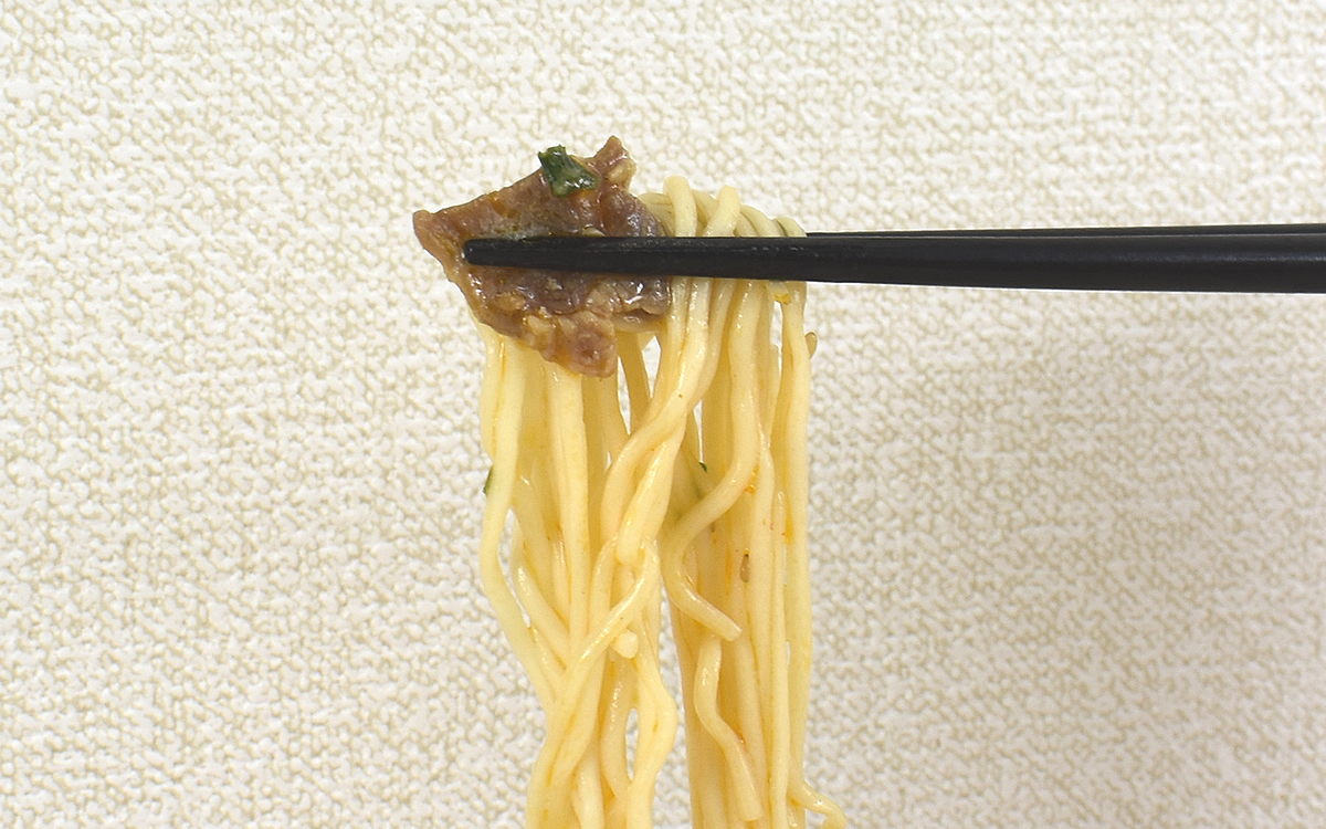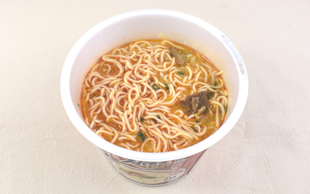 カップ側面に記された調理方法に従ってラーメンを完成させると、豚骨スープと辛ダレが絡み合った芳醇な香りがふわり。従来の豚骨スープとは異なる匂いに期待を膨らませながら麺をいただいたところ、ポークエキスの風味が広がることに。「あれ? 辛くない?」と思ったのも束の間、ピリピリした刺激が舌の上を覆っていきます。