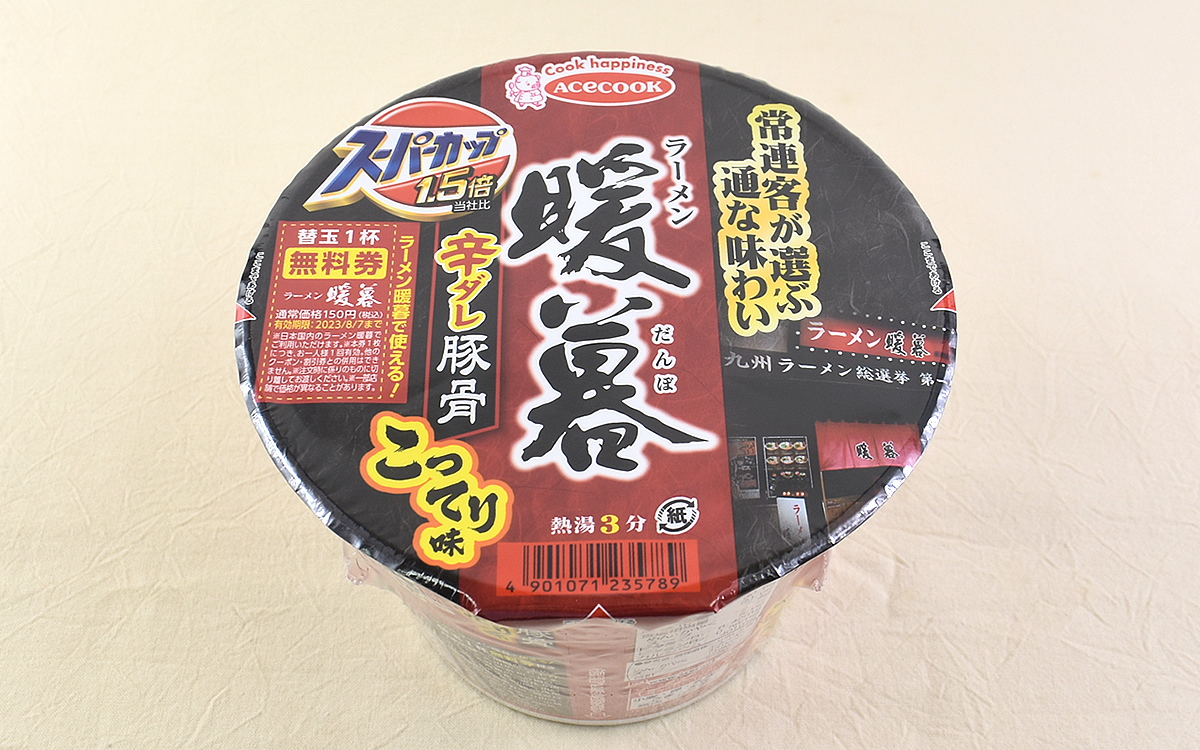 商品名に含まれている「ラーメン暖暮」とは、福岡県筑紫野市に本店を構える人気の豚骨ラーメン店のこと。「九州ラーメン総選挙」で1位を獲得したこともある実力派で、現在は九州以外にも東京や神奈川などに出店しています。ちなみに「辛ダレ豚骨 こってり味」は、エースコックのブランド「スーパーカップ」とのコラボ商品。スーパーカップならではのボリュームを楽しめるので、お腹をしっかり満たしたい時にぴったりではないでしょうか。