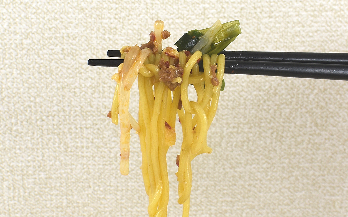 コンパクトなパックのちょい麺シリーズながら、フタを開けるとトマトや鶏そぼろなどの具材がたっぷり。別添のにんにく入り醤油ラーメンスープも投入して麺からいただくと、ガラスープににんにくの香りが絡む濃厚な味わいが口の中を覆っていきます。ところがほんの少し間を置いた瞬間、ピリリとした刺激が一気に炸裂。辛さは5段階レベルの3に該当している商品ですが、旨味をしっかり感じられる点も見逃せません。