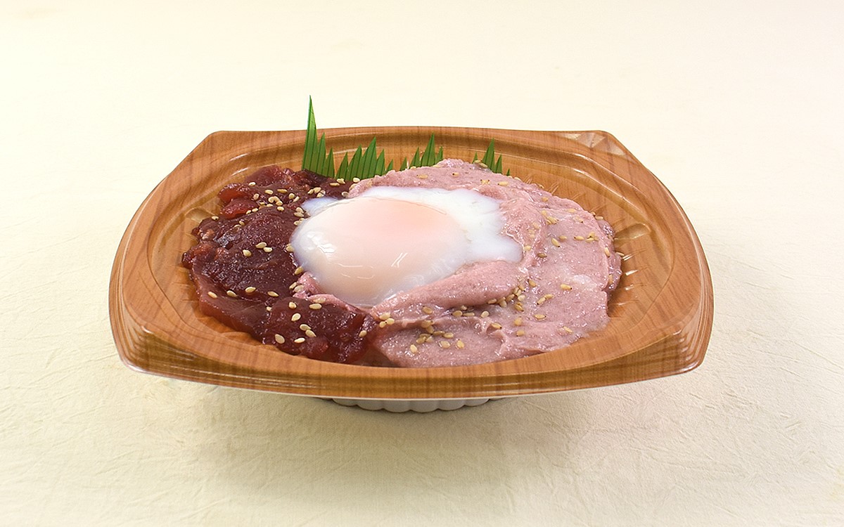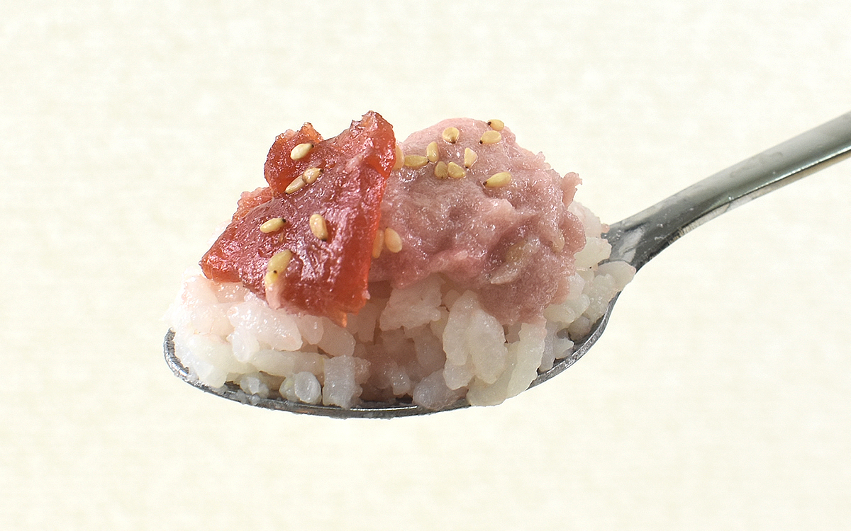 「漬けまぐろ鉄火丼」に使用されているのは、漬けまぐろの切り落としと醤油タレで味つけしたまぐろのたたき。さらに半熟たまごも入っていて、まぐろの赤身と半熟の白味が鮮やかな色合いを放ちます。さっそく切り落としからいただくと、通常のまぐろ切り身からは得られない濃厚な旨味が拡散。漬けまぐろ特有のなめらかな舌ざわりもたまりません。