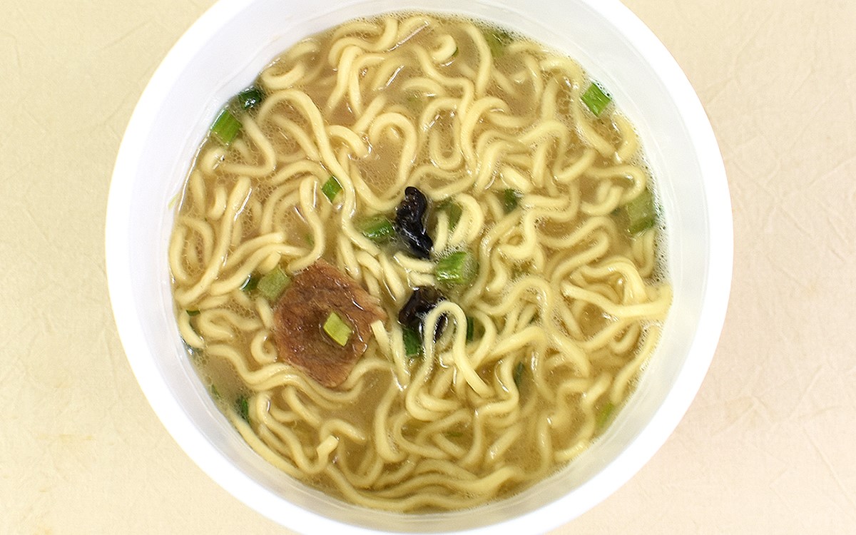 カップ麺は熱湯を注いで3~5分待つものがほとんどですが、濃厚豚骨ラーメンは湯戻し2分なので調理はあっという間。さっそくスープをいただいたところ、白濁した見た目とは裏腹に脂っぽさをあまり感じさせない味わいに驚かされます。豚骨特有のコクが広がりつつも口の中を覆うのは優しい風味。くさみがほとんどないため、最後の1滴まで飲み干せそうです。