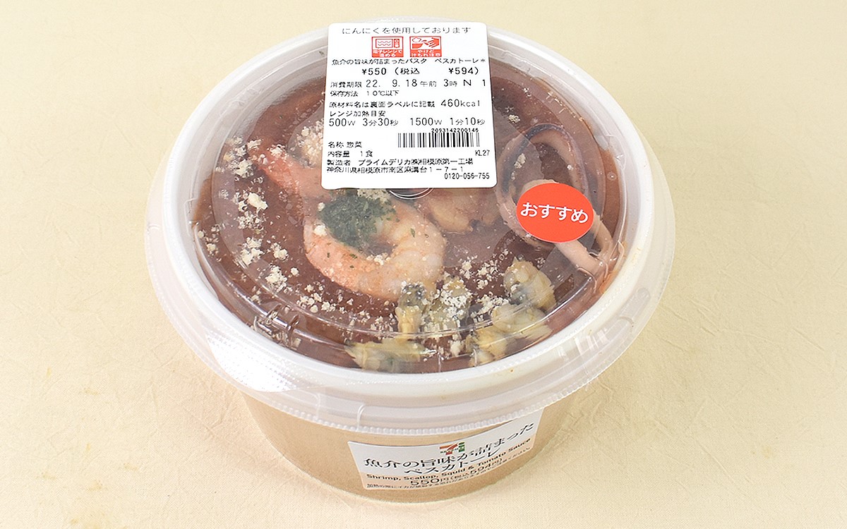 洋食の中でも高い人気を誇るパスタは、ソースや具材がおいしさの決め手になりますよね。専門店だけでなく、近年はコンビニでもこだわりの具材をトッピングした商品が盛りだくさん。そこで今回は、セブン-イレブンで販売されている「魚介の旨味が詰まったペスカトーレ」(594円/税込)をチョイスしてみました。“魚介の旨味が詰まった”と銘打つほどの味わいを、じっくり確かめていきましょう。