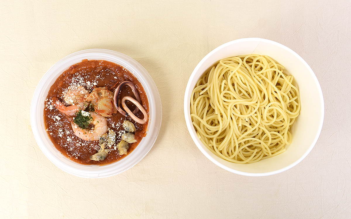 レンジで加熱調理(目安時間 500Wで3分30秒)をおこなってからフタを開けると、さっそくトマトソースの芳醇な香りがふわり。ソース・具材と麺が分かれているので、それぞれを混ぜ合わせてから麺を一口いただいてみました。するとトマトソースの味わいが広がると同時に、魚介のこうばしい風味も拡散。さらに“にんにくピューレ”が醸し出す香りも加わり、口の中はあっという間に濃厚な味わいでいっぱいになっていきます。