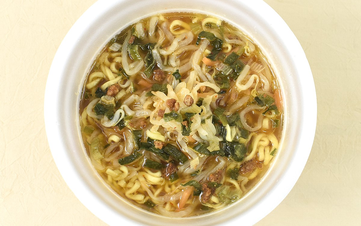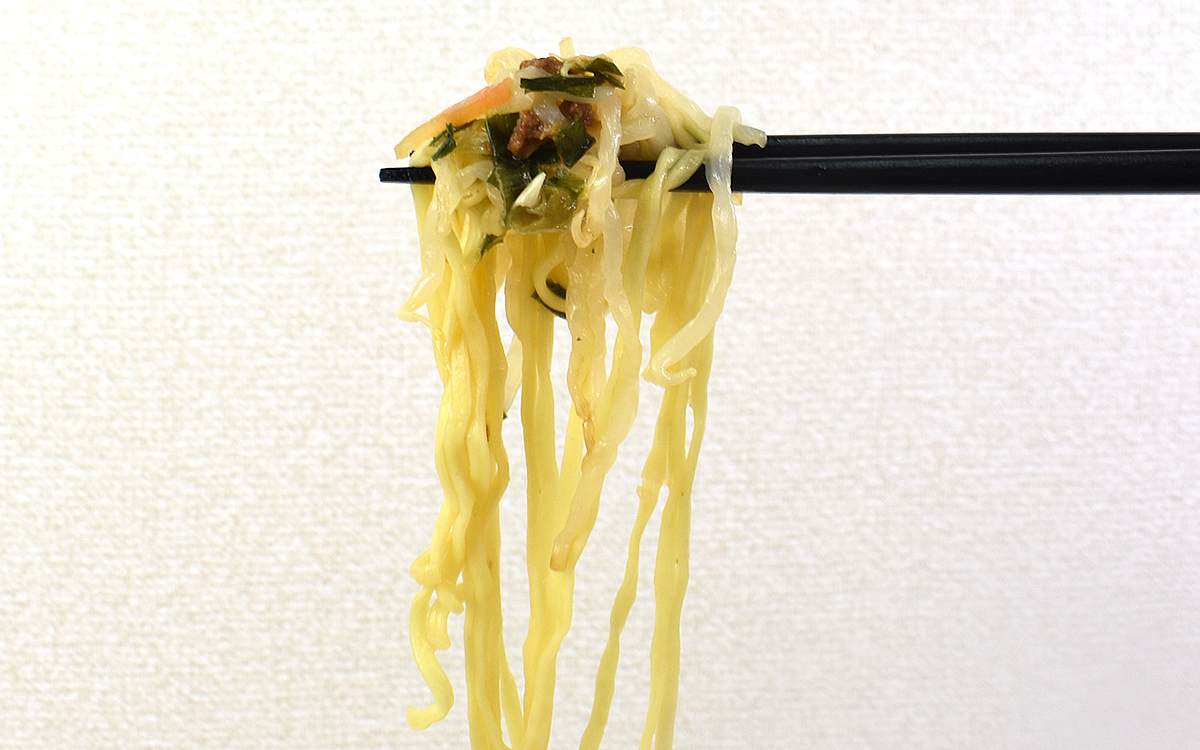 同商品に使用されている麺は、食べごたえをしっかり感じさせてくれる中太麺。こってり感のないスープをまとうことで、思いのほかツルっと口の中に飛びこんできます。またトッピングはもやしばかりに目を向けがちですが、たっぷり入った挽肉・ねぎ・にんじんも要注目。さすが味噌ラーメンには野菜が合うとあって、素材の甘みと香りがほどよくアクセントになってくれました。