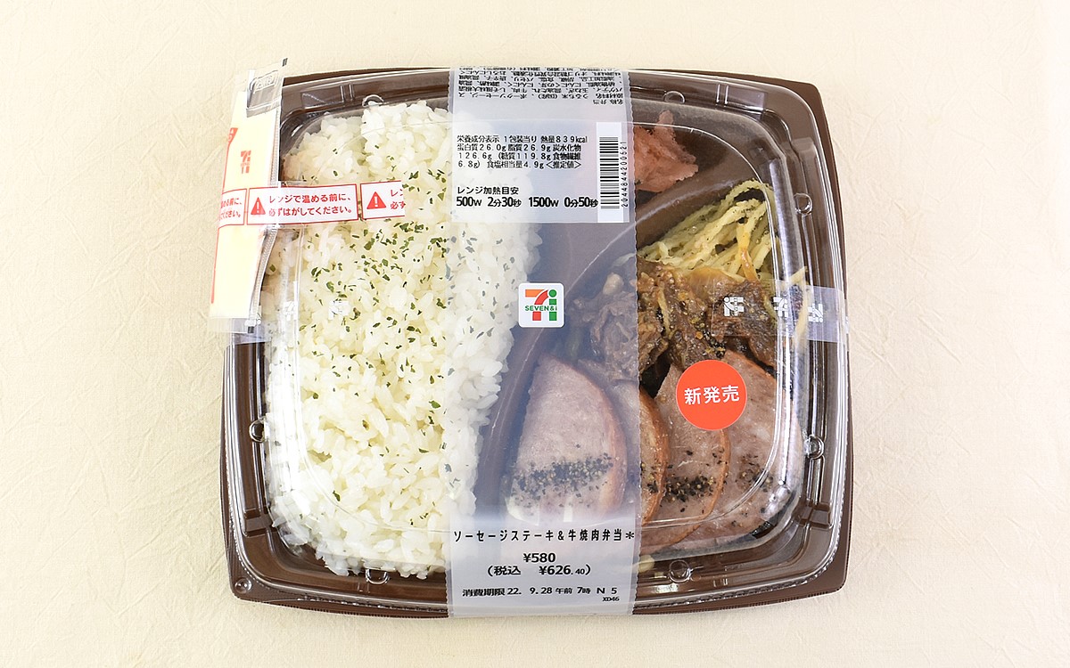 趣向を凝らした味つけや海外の人気メニューを再現した内容など、多種多様な展開を見せているコンビニ弁当。でもたまには、敢えてシンプルなメニューに戻りたくなる日もありますよね。焼肉弁当や幕の内弁当など、定番だからこその味わいを楽しめるのも魅力の1つ。そこで今回は、セブン−イレブンの「ソーセージステーキ&牛焼肉弁当」(626円/税込)に注目してみました。
