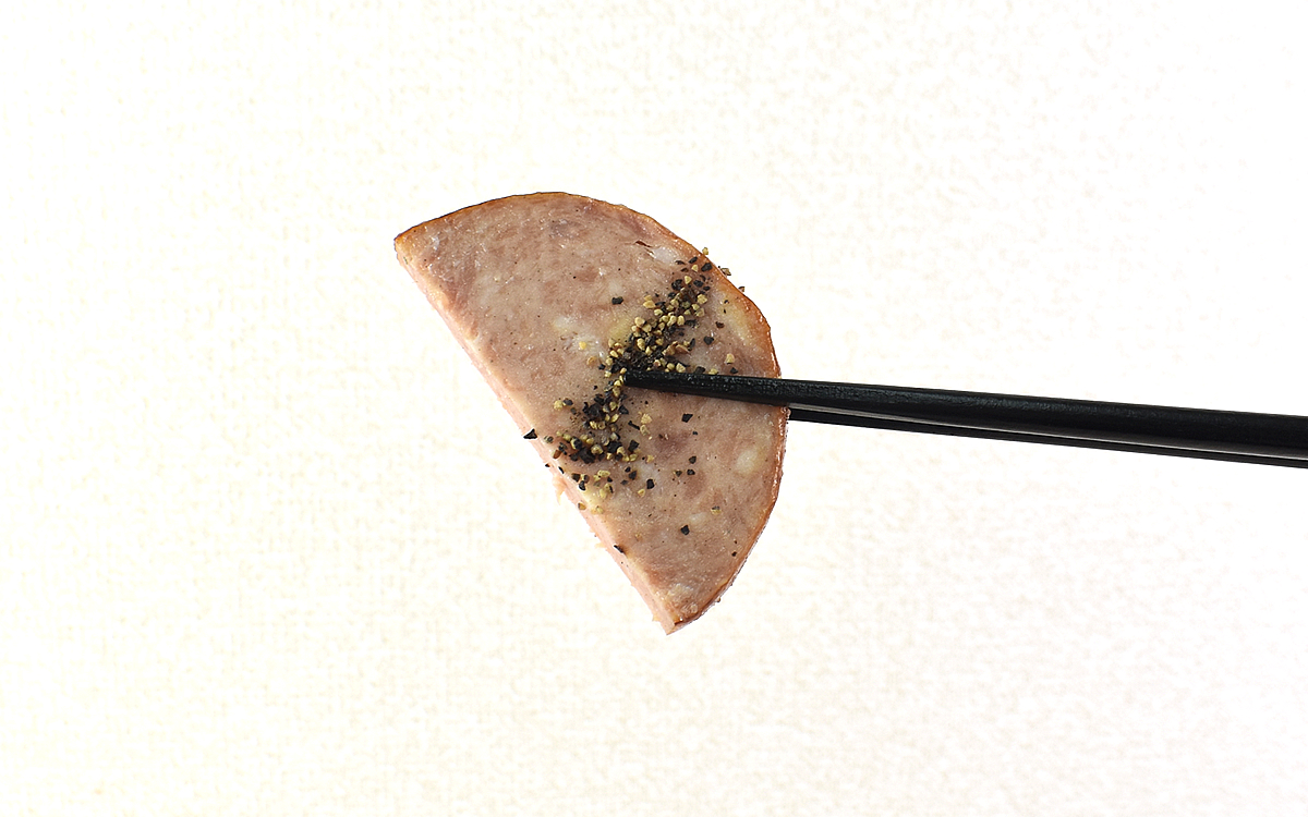 さっそくソーセージステーキからいただくと、ひと噛みした瞬間からあふれ出すポークの旨味に思わずうっとり。大きさだけでなく厚みもあるので、しっかり食べごたえを感じさせてくれます。また下の画像からもわかるとおり、表面にまぶされたブラックペッパーのピリっとした刺激もGOOD。コクを楽しみたい時は、付属のマヨネーズをかけていただくのがオススメです。