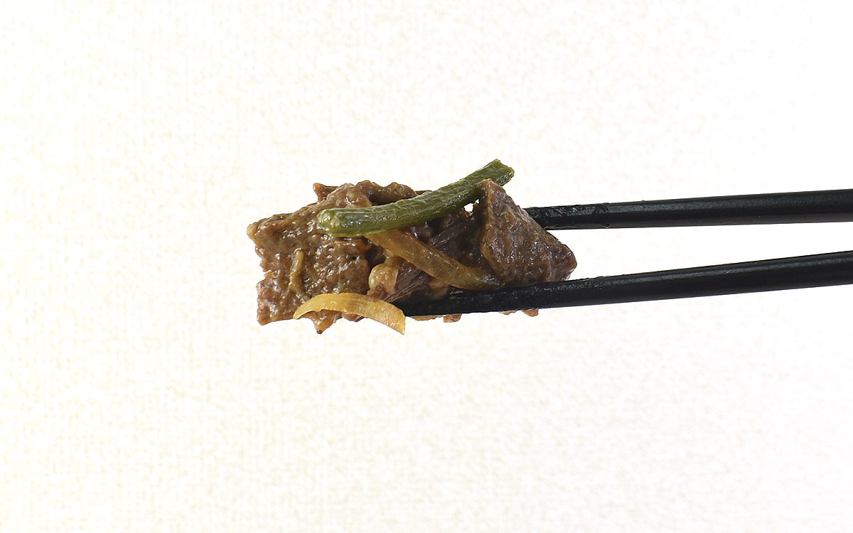 続いていただいたのは、にんにくの芽や玉ねぎを従えて鎮座する牛焼肉。醤油たれで味つけされているため、牛肉本来の旨味とともに奥深い風味を感じさせてくれます。にんにくの芽と玉ねぎの歯ごたえもさることながら、牛肉のやわらかな食感がたまりません。
