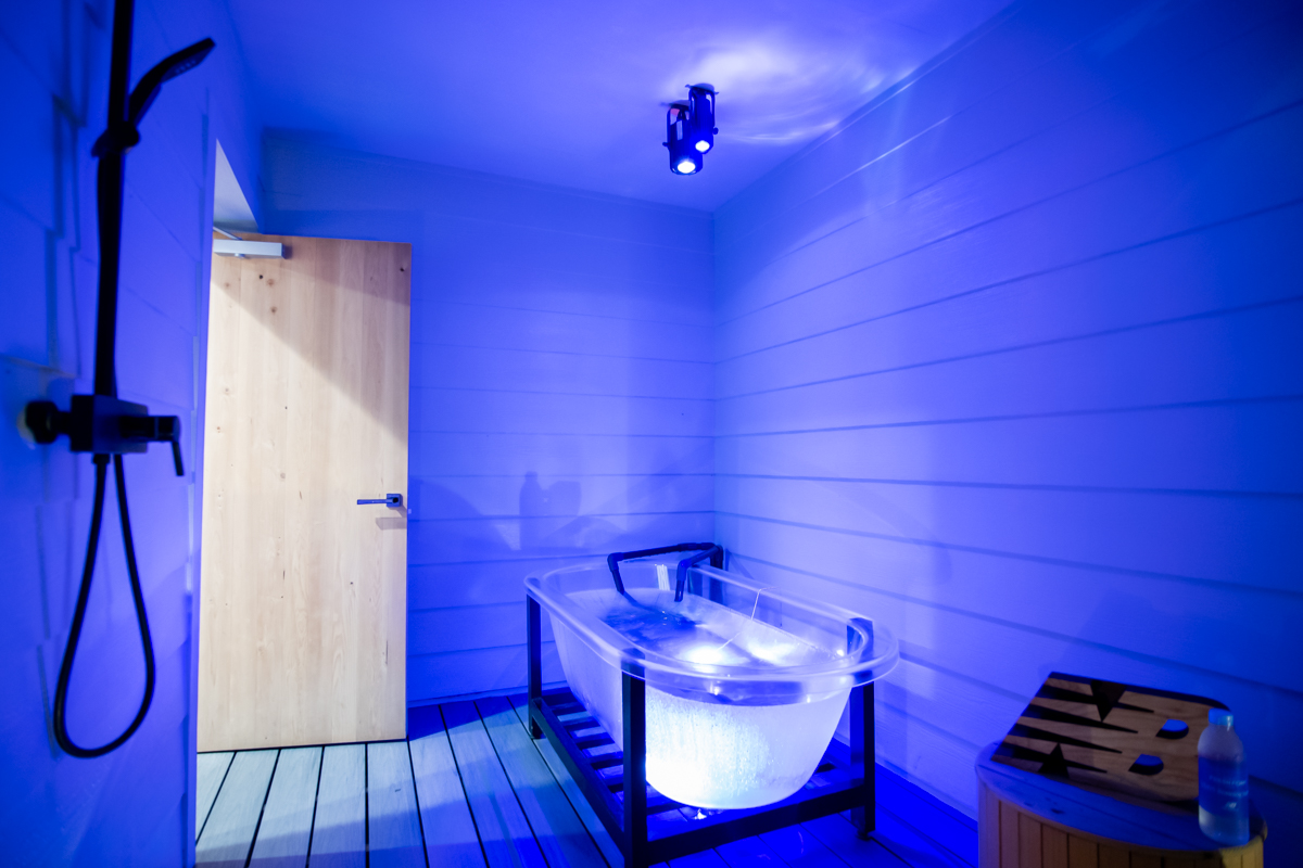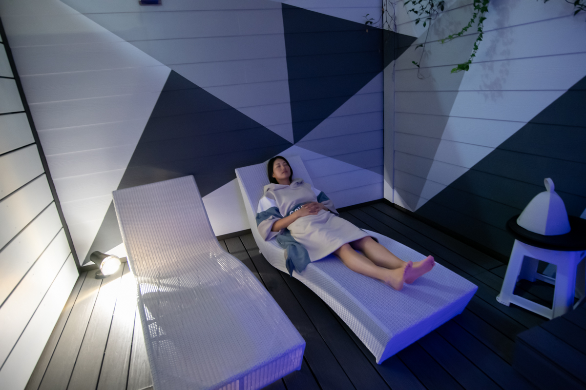 一人用の透明な浴槽の水風呂は、水温13〜15度くらい。熱々の身体が一気にクールダウン。私は1回目の水風呂は控えめに入るようにしているので一瞬で出て、外気浴スペースのゴロンと寝転がれる椅子で一休みしてから2セット目へ。