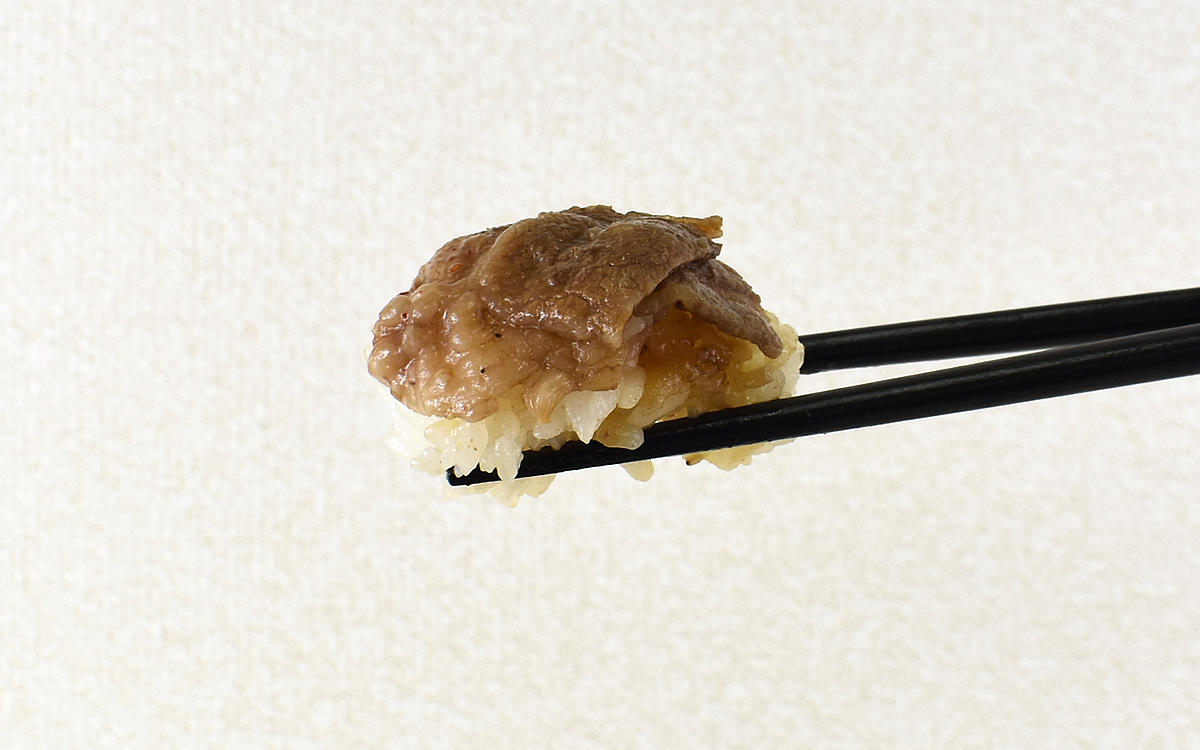 平均的な弁当のパッケージよりやや小さく見えますが、商品を手にした瞬間からずしりとした重みが。パっと見たところ角にちょこんと添えられた大根の漬物を除いて、野菜類は一切見当たりません。焼肉弁当なので当然と言えば当然ですが、余計なものを入れるスペースがあるなら肉を入れるという心意気(?)を頼もしく感じます。