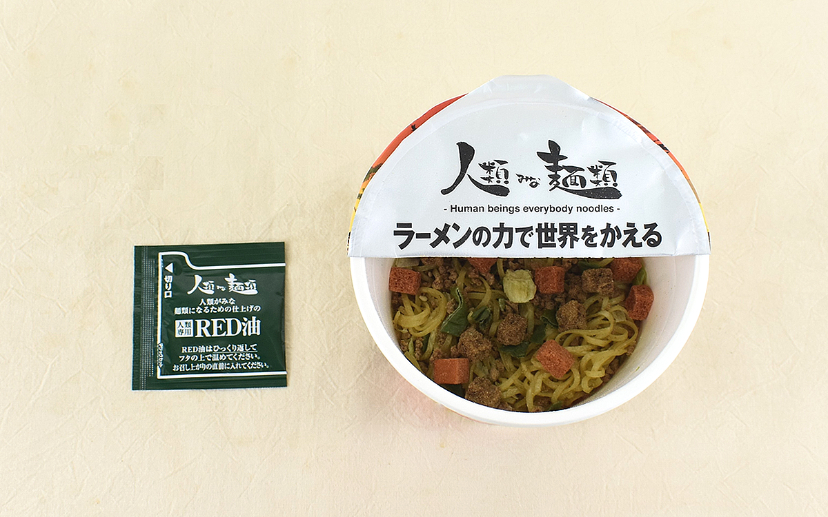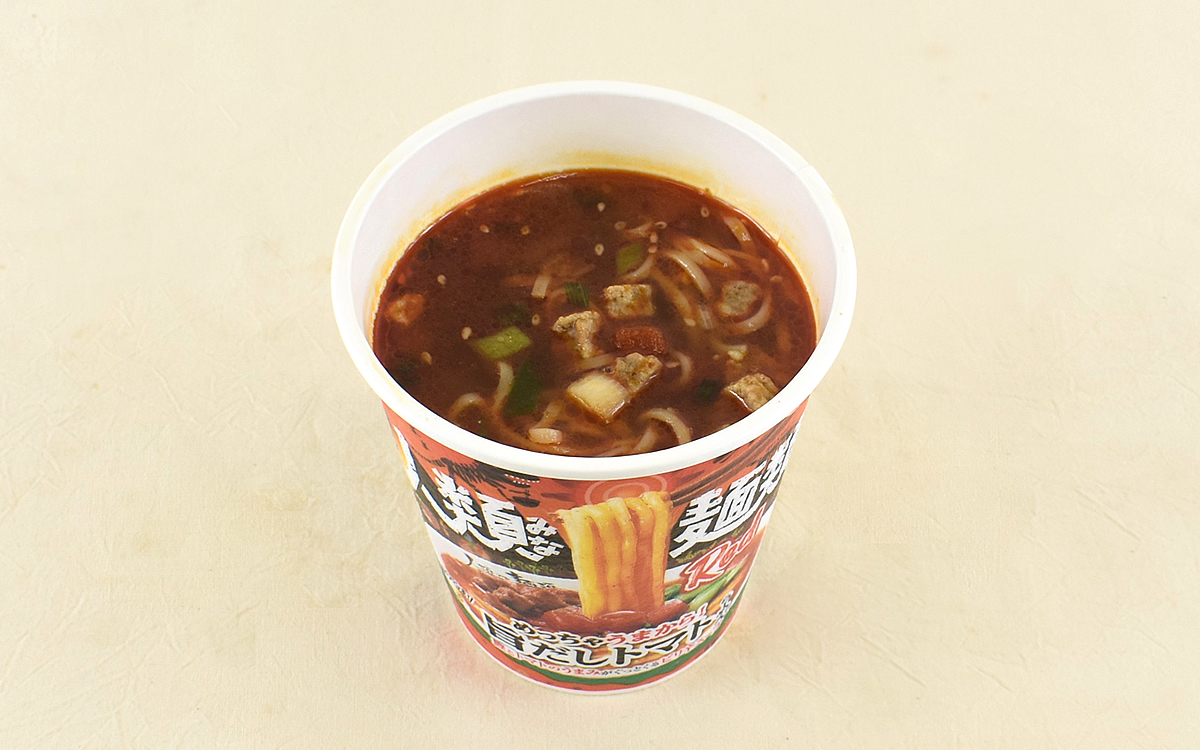 なかなかインパクトのある商品名ですが、「人類みな麺類」とは大阪市淀川区に店舗を構える醤油ラーメン専門店のこと。入口には「麺」の1文字が掲げられているだけですが、公式サイトには「それでも人はやってくる。そう、それは『人類が麺類である』証」という説明も。ちなみに今回購入した「旨だしトマトらーめん」は、かつて人気を博した「人類みな麺類RED」をカップ麺として限定復活させた商品でもあります。