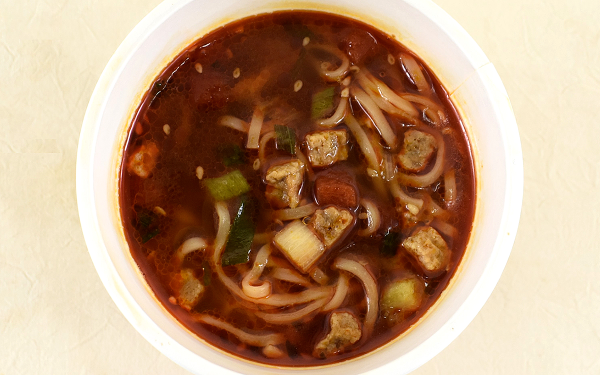 トッピングは味付豚ミンチとねぎの黄金コンビに加えて、トマト加工品も。専門店でいただく機会の多いトマトラーメンが手軽にいただけるのも、まさにカップ麺ならではの魅力といえます。時おりプチっと感じるゴマの風味もアクセントになりつつ、旨辛トマトラーメンの味わいを存分に堪能することができました。