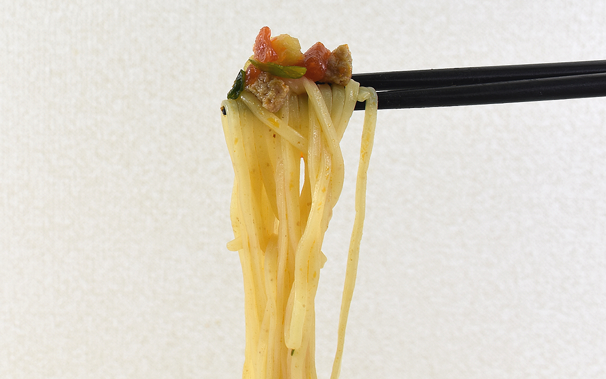 調理を終えたスープは見るからに辛そうですが、「トマトの色に違いない」と自分に言い聞かせてまずは麺から一口。するとかつおだしとトマトの旨みが最初に広がり、ラーメンというよりはパスタをいただいているような感覚が。そう思ったのも束の間、ピリピリした刺激が一気に口の中全体を覆っていきます。