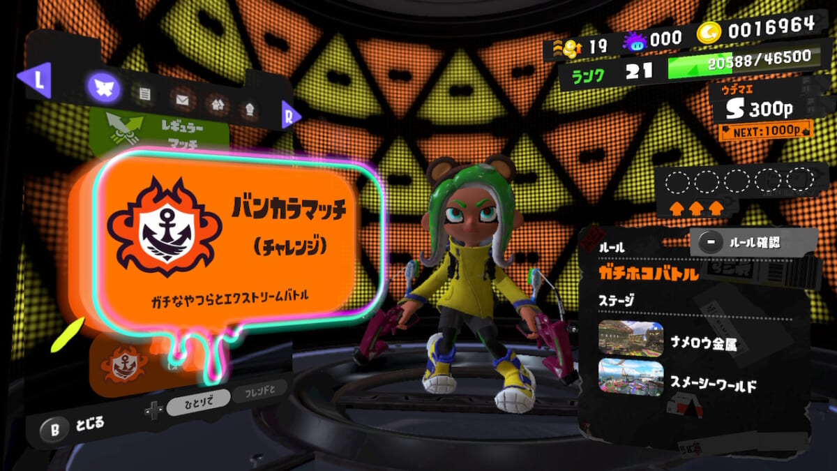 バトルを真剣に遊びたい人向けには、「バンカラマッチ」という対戦モードが用意されています。バンカラマッチでは動くヤグラに乗ってゴールを目指す「ガチヤグラ」や、アサリを集めてゴールにシュートする「ガチアサリ」など4つのルールがあり、いずれも基本モードのナワバリバトルよりも撃ち合いが発生しやすいルールになっています。