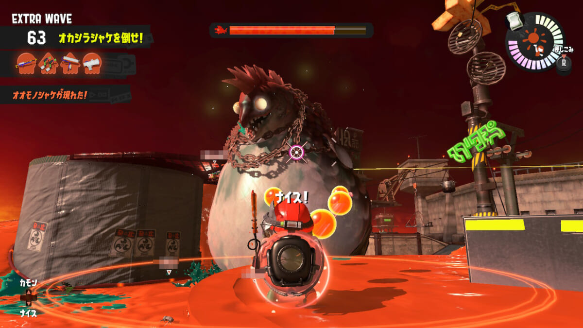 また。本作のサーモンランでは新要素として、数回遊ぶごとにボーナスステージとして、強大なボスキャラ「オカシラシャケ」が登場するようになりました。オカシラシャケの1つ「ヨコヅナ」が、大怪獣かと思わせる巨体で攻撃をしかけてくる様は圧巻。なかなか倒せませんが、与えたダメージに応じて報酬がもらえます。