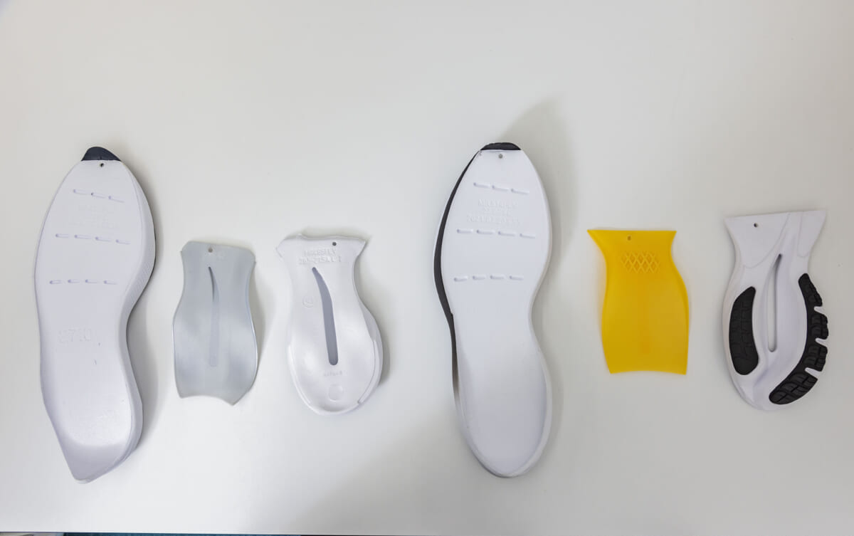 ランニングシューズは、さまざまな部材が組み合わさって作られる、労働集約型を代表する商品のひとつだ。走行時に最も屈曲する甲の部材(アッパー)、ひもの通し方だけでシューズのフィッティングを自在に操ることができるシューレース、つま先からかかとまで足を包み込むアッパー、着地衝撃を緩衝して推進力に替える靴底のクッション材(ミッドソール)、中足部のアーチをサポートして走行安定性を高めるプレート(シャンクとも呼ぶ)、地面をとらえる着地面のアウトソールなどなど。