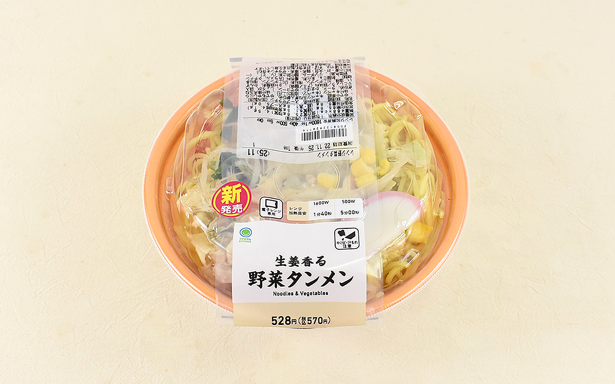従来の醤油ラーメンや塩ラーメンなどとは異なり、ドカっとトッピングされた野菜が大きな魅力のタンメン。「ラーメンと一緒に野菜もしっかり摂りたい」という人にぴったりのメニューですよね。11月22日からファミリーマートで販売がスタートした「生姜香る野菜タンメン」(570円/税込)も、まさにそんな欲求を満たしてくれる一品。果たしてそのお味は…?