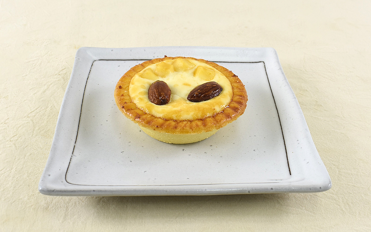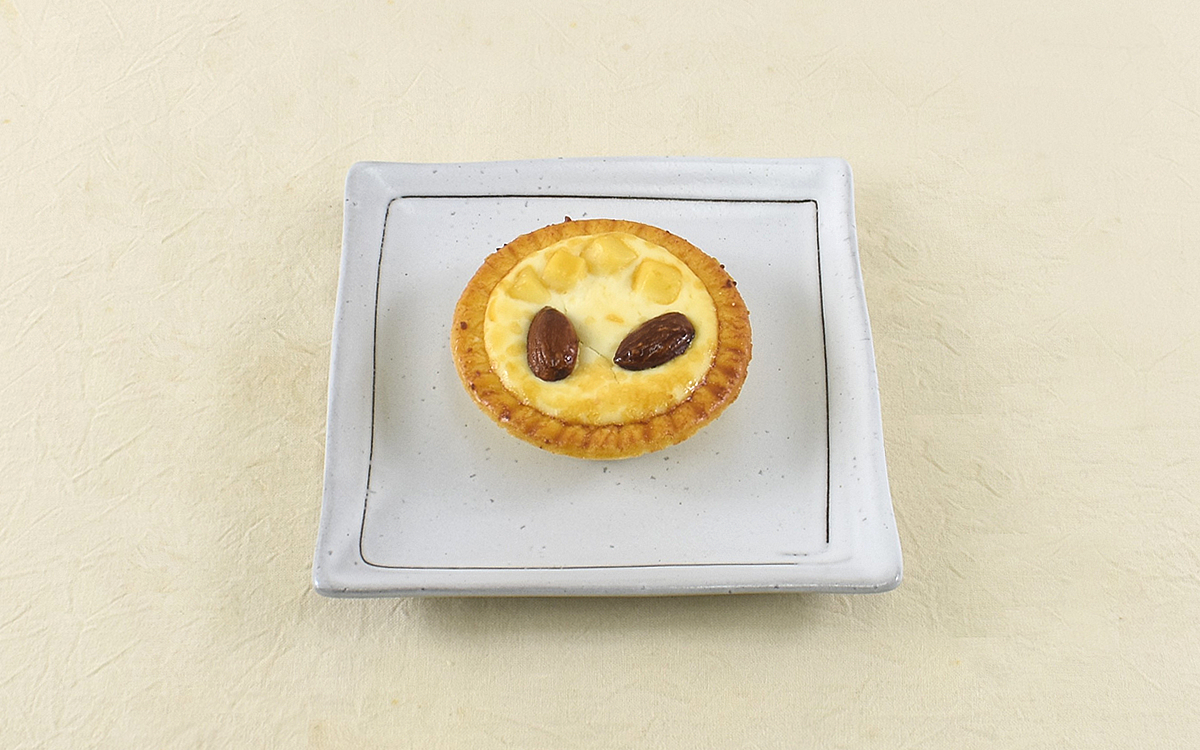 パッケージから取り出したタルトは、ちょうど手のひらに収まるほどのサイズ感。艶のあるチーズフィリングに加えて、2粒のアーモンドとキューブ型チーズも目を引きます。さっそく一口いただくと、噛みしめた瞬間にチーズ特有の塩味が拡散。タルトといえば甘いイメージだったので、思わぬ先制パンチに意表を突かれてしまいました。