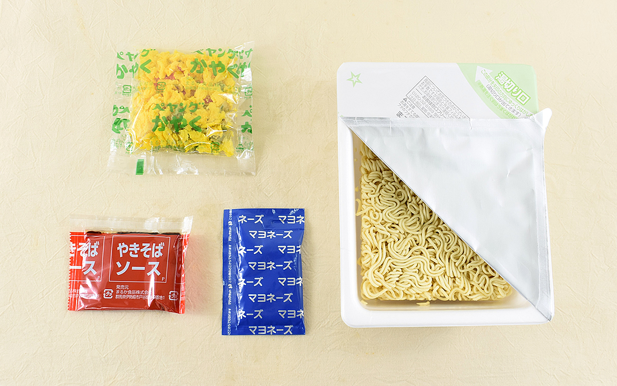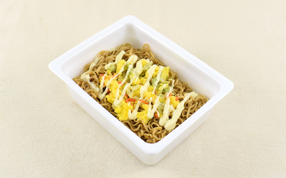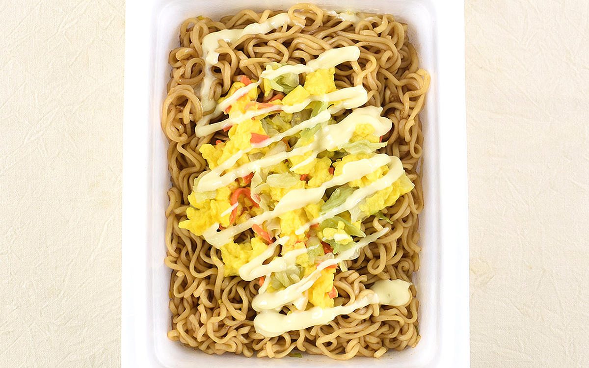 「オムそば風やきそば」は乾燥麺の他にかやく・ソース・マヨネーズの小袋が入っていて、調理を終えるとソースとマヨネーズが絡み合ったこうばしい香りが。さっそく麺から口に運んだところ最初にマヨネーズの味わい深いコクが駆け抜け、直後にソースの風味が広がっていきます。どちらかの主張が強いということはなく、2つの味が重なるバランス感が絶妙。