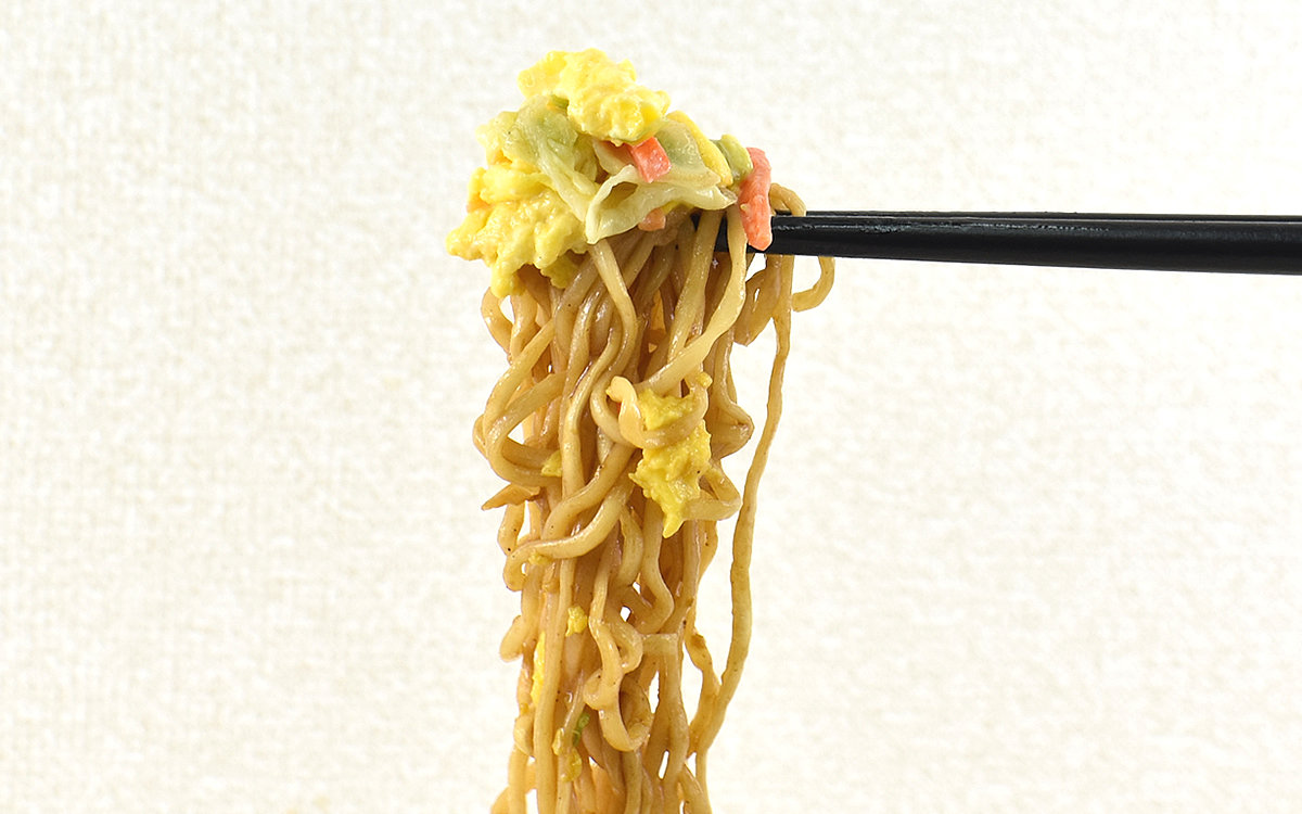 カップ麺でオムそばを再現しようという発想もさることながら、たまごのふんわり感も格別です。なめらかな口あたりが心地よく、調理前まで乾燥具材だったとは思えない食感に誰もが驚くはず。麺やソースとの相性もよく、“焼きそばに合うのは目玉焼きだけではない”と考えを改めました。