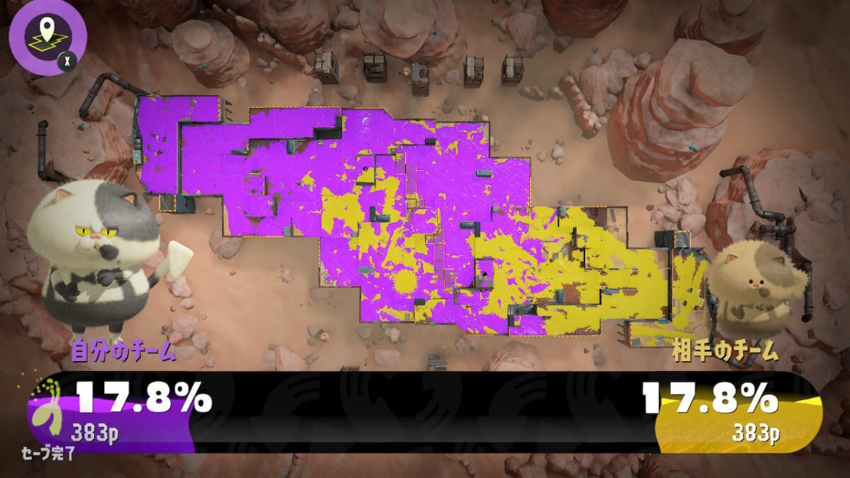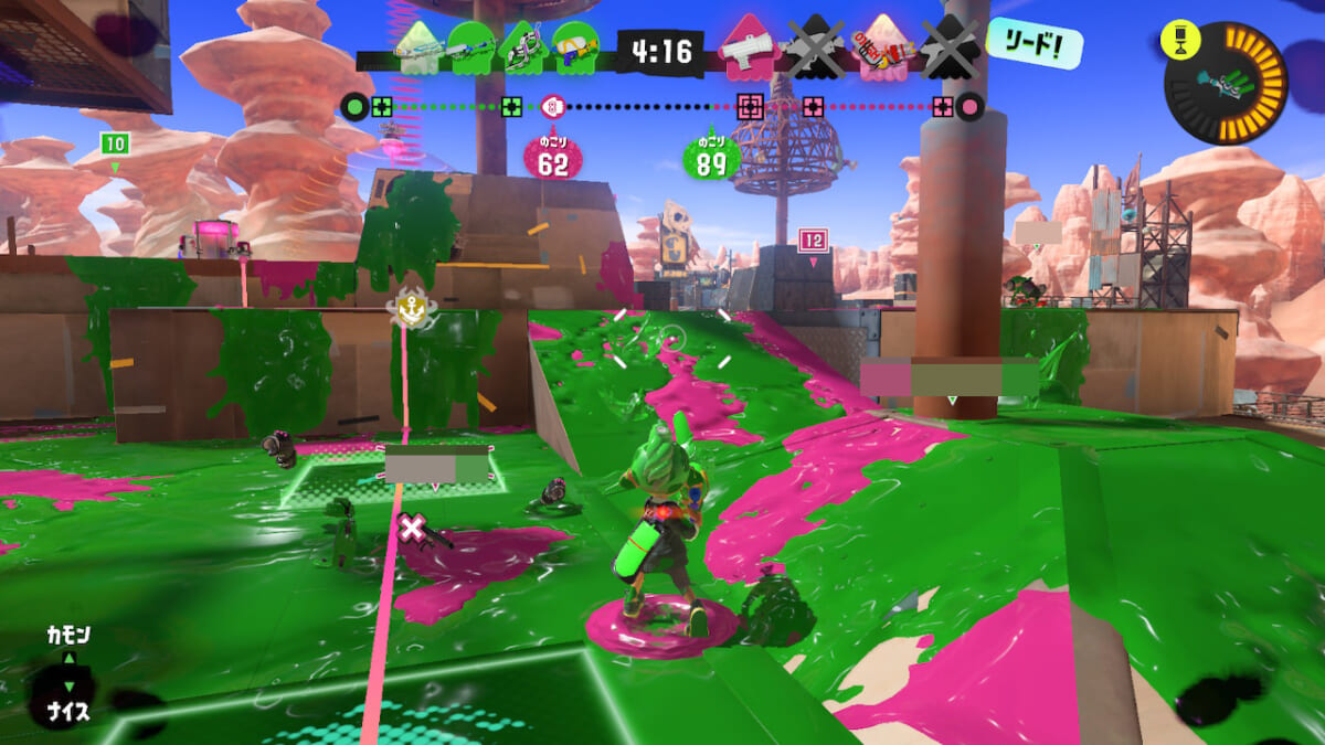 シューティングゲームなので、敵チームのイカやタコを攻撃で倒していくという要素を持っているのですが、それが勝利条件そのものではないというのも特徴。本作の目的はルール毎に違いがあるのですが、代表的なのは「自分のチームのインクで塗った面積の強い方が勝利」というもの。また敵を倒すにしても、インクを塗ることで倒すというかたちなので、シューティングゲームに多い暴力的な世界観ではなく、ポップな世界観に仕上がっています。