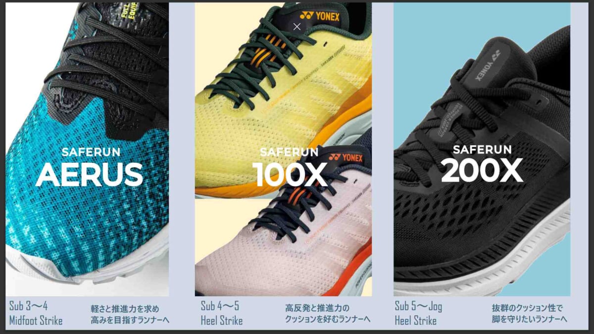 ランナーの怪我で最も多い、膝の負担を和らげるSAFERUNシリーズ。中でもSAFERUN 200Xは、YONEX史上最大ボリュームのクッション性に、YONEX史上最大のソール幅。従来品「SAFERUN 200」と比較してクッション性は+11%、ソール幅は+17%と、大幅に進化しています。