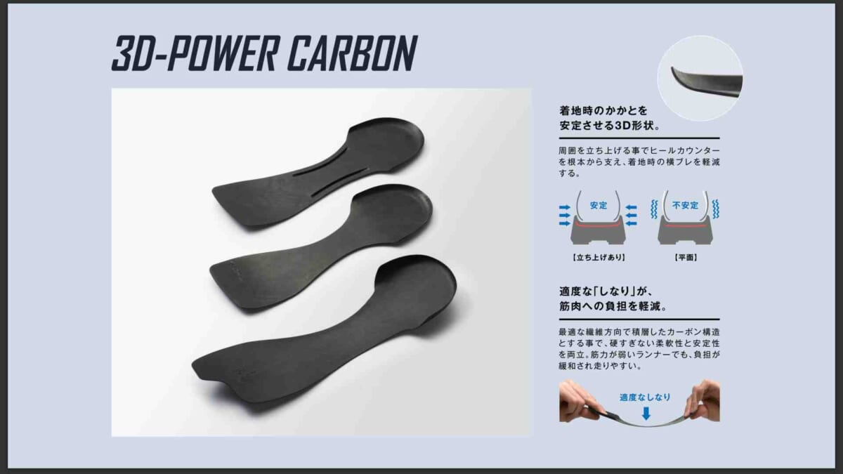 ソールに厚みがあると気になるのは横振れや安定感ですが、ソール中心部が肉抜きしてあり、重心が中央に集中することにより横振れも抑制されます。踵を包み込むような3D-POWER CARBONも相まって、着地に安心感がありました。