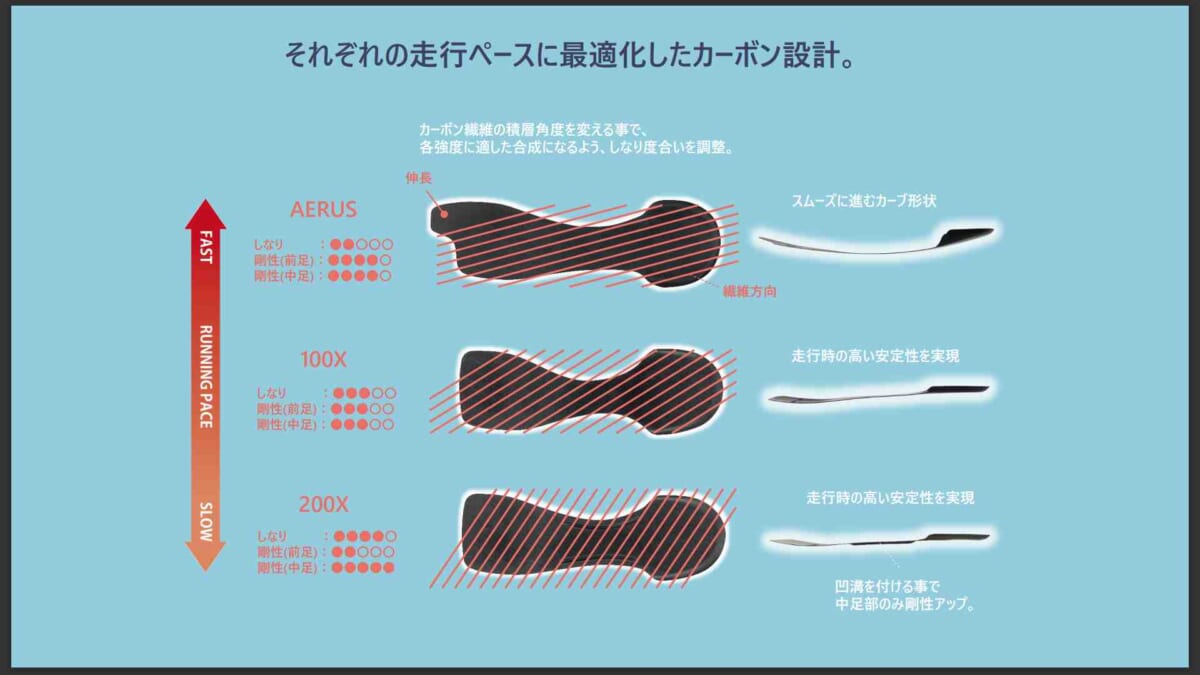 SAFERUN 200Xに使われている“3D-POWER CARBON”は、中足部に高い剛性を持たせつつ、前足部は適度にしなる仕組み。さらに母指球部分を少し浮かせたロッカー形状のソールにより、自然と脚が前に出てより楽に走れます。