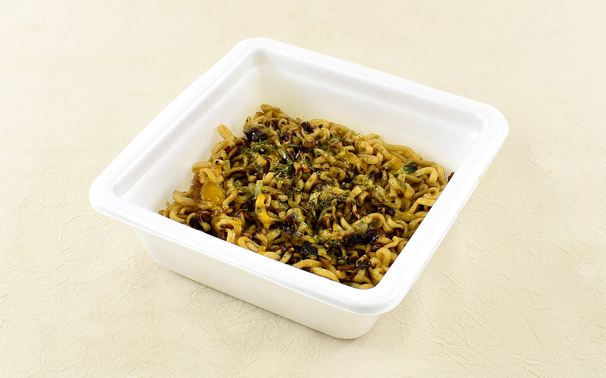 熱湯調理(5分)を終えてまずはソースから絡めると、さっそく濃厚かつこうばしい香りがふわりと漂ってきました。とはいえ普段から親しんでいるソースとは何かが違うと感じながら麺を口に運んだところ、その理由に納得。ソースに溶け込んだ野菜の旨みがはっきり出ていて、従来の焼そばソースよりも奥深い風味を堪能できます。