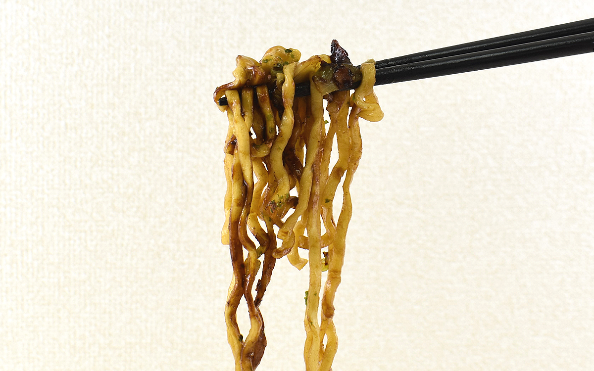 一般的な焼そばと異なる点がもう1つあり、同商品は丸い細麺ではなく平たい極太麺を使用。そのため想像以上のモチモチ食感を発揮し、お腹にじっくり溜まっていくような食べごたえを感じさせてくれます。またソースに加えてたまごタレが麺の至るところに絡まり、コクを与えつつまろやかな口あたりに変化させているのもGOOD。