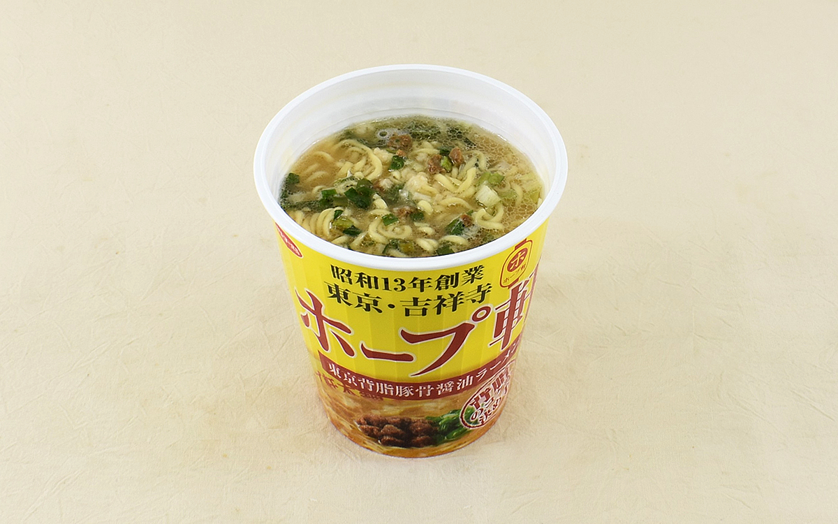 「ホープ軒本舗」といえば“東京背脂豚骨醤油の始祖”として名を馳せ、トッピングを除いて中華そばとチャーシュー麺のみを提供する老舗ラーメン店。角切・番手24番のちぢれ細麺を使用し、防腐剤不使用という点からも麺に対するこだわりが垣間見えます。また同店最大の魅力は、なんといっても丹念に炊いた豚骨や野菜から抽出される濃厚なスープ。そんな人気の味わいを、「東京背脂豚骨醤油ラーメン」ではどこまで再現しているのでしょうか。