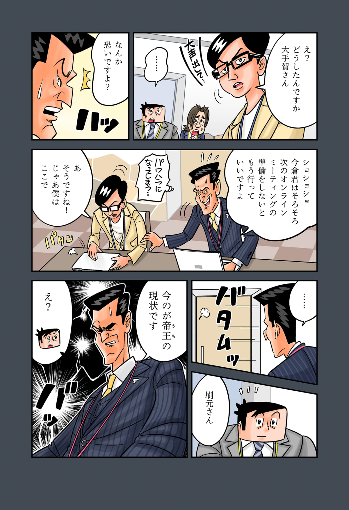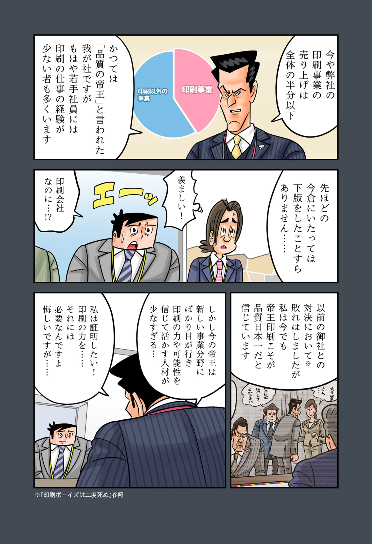 「印刷業界」の裏側をテーマにしたマンガ「今日も下版はできません! 」。ナビ印刷株式会社の営業マン・刷元 正(スリモト・タダシ)と沖田功人(オキタ・コウト)が印刷業界にまつわる「あるある」を、涙あり、「なるほど」や「へぇ~」ありで語っていきます。