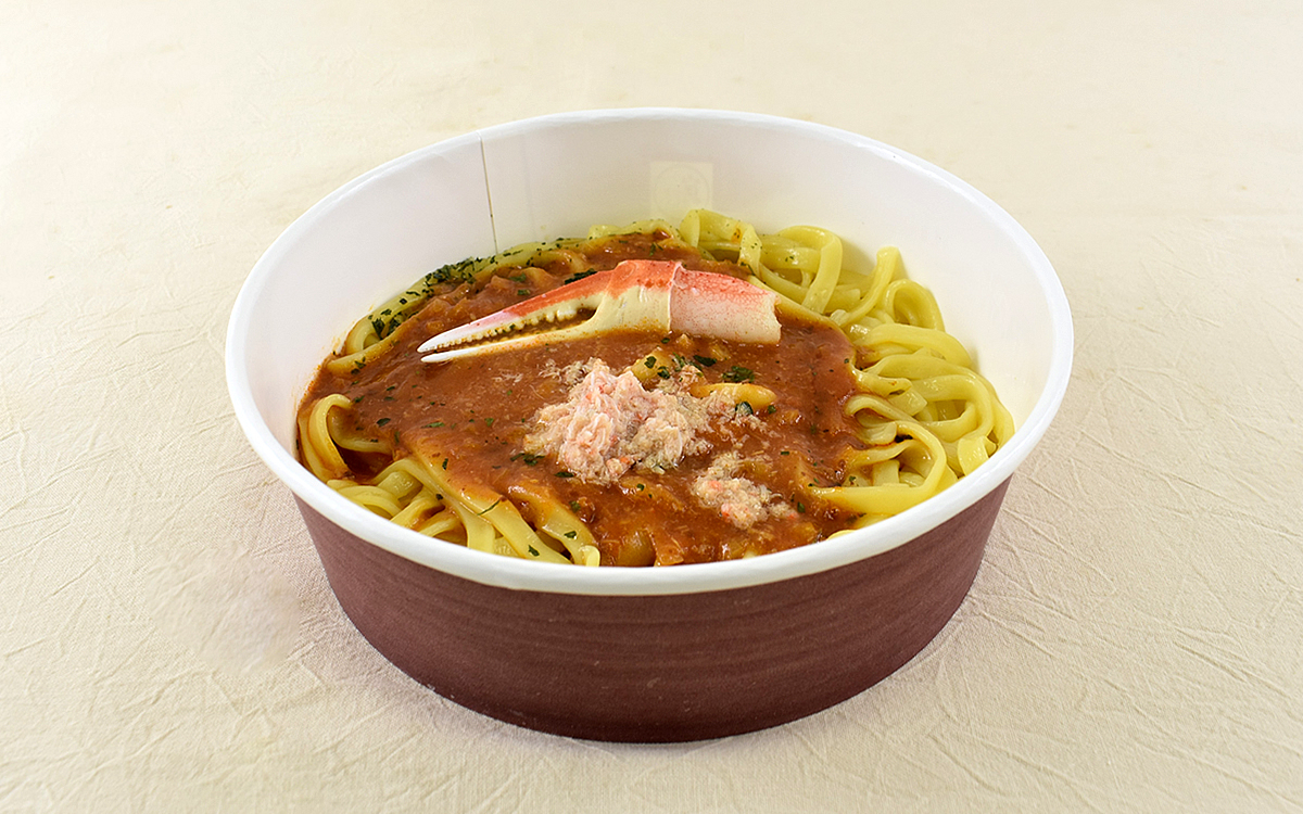 商品名に「蟹」と冠しているとはいえ、やはり真っ先に目を向けてしまうのが立派な本ズワイ蟹の爪。それだけでもコンビニパスタとしては十分贅沢なのに、ふんだんに添えられた紅ズワイ蟹のほぐし身も大きな魅力です。レンジで加熱調理(目安時間 500Wで3分)をおこなってからパスタとソースを絡めていくと、早くも蟹のこうばしい香りが…。