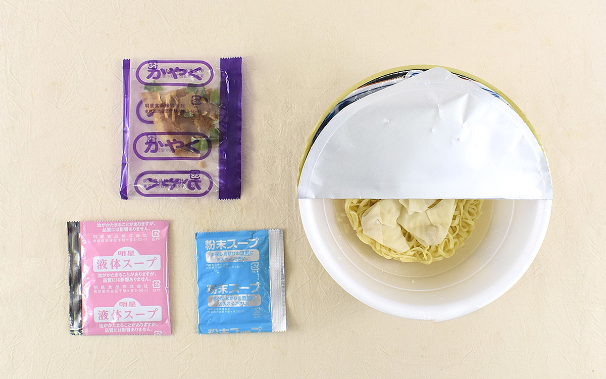 「とら食堂 ワンタン麺」はパッケージ内に粉末スープ・液体スープ・かやくの小袋が封入されているので、熱湯調理(5分)後に液体スープを投入して完成。ぷかりと浮かぶワンタンが麺以上に存在感をアピールしてきます。誘惑に負けてさっそく1ついただいたところ、お湯を注ぐ前までカチカチに乾燥していたとは思えないなめらかな食感にびっくり。舌の上をすべるように移動し、破れた皮の中から具材の旨みがじゅわっと広がることに……。