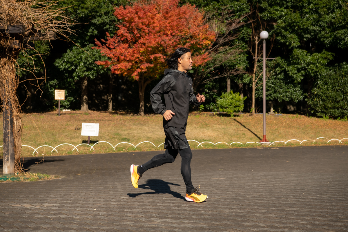 距離を踏むと、普段のランニングではない筋肉の使い方を感じる。理由は、やはりカーボンプレートの存在だろう。データを取った訳ではないが、蹴り出しの位置が、他のシューズよりも手前(中足部)にある印象だ。土踏まずのアーチや母指球から強いバネで押し出される感じ。なお、私はファンラン志向の昭和のヒールストライカー(かかと着地)なので、カーボンのバネをより強く感じたのかもしれない(前足部=フォアフットで着地する方は、異なる感覚を得るはず)。