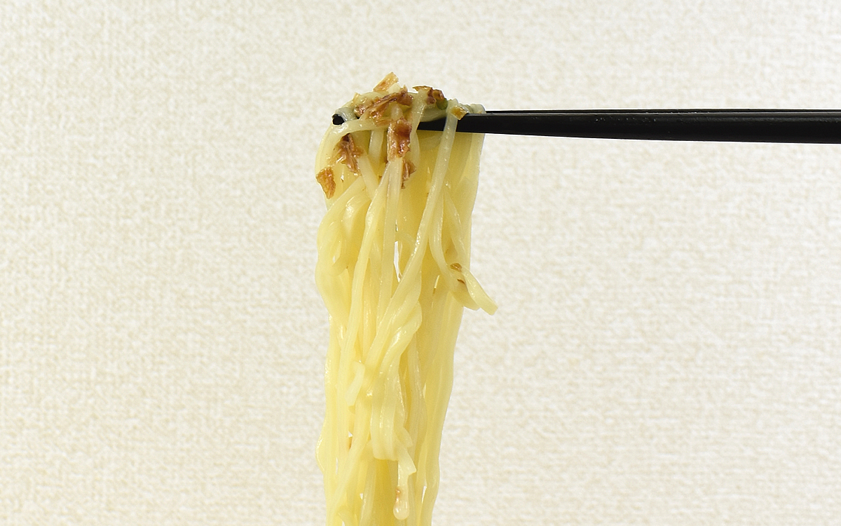 麺には歯切れのいいストレート麺が使用されていて、スープの油をまといながらつるんと口の中へ飛びこんでくる感触がGOOD。歯ごたえを残しながらもモチモチした食感は豚骨ラーメンに相応しく、カップ麺とは思えない仕上がりです。