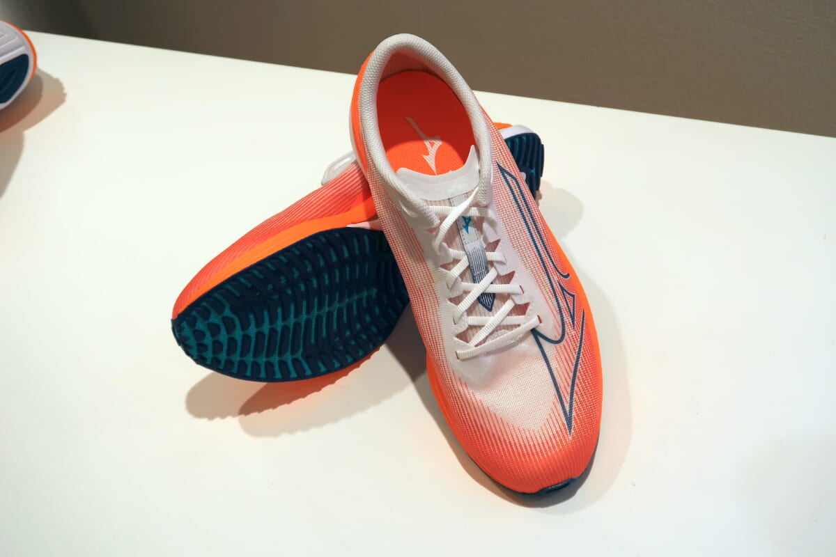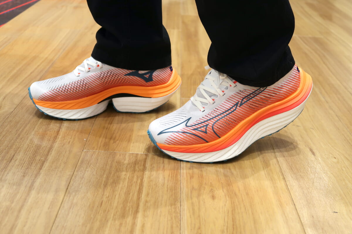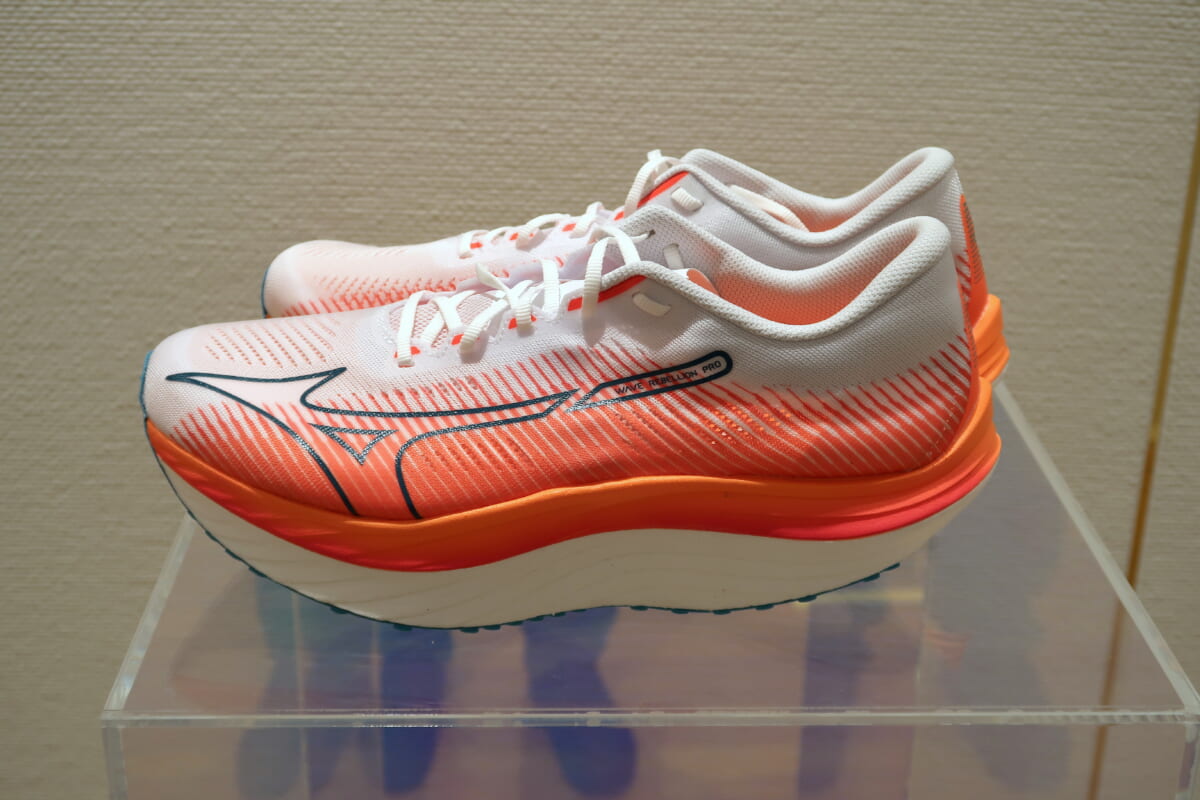 目がとまる独特の形状、カラーリングも爽やかなウエーブリベリオンプロを筆者が実際に履いてみると、自然と前傾姿勢になり推進力の高さが体感できます。また、見た目以上に軽く、クッション性の高さにも驚き。「人を最速で走らせるために、いかにスムーズなスピードランニングを考えるか」というプロジェクトを今後も続けるミズノが、現在の最新技術を凝縮させたランニングシューズ。