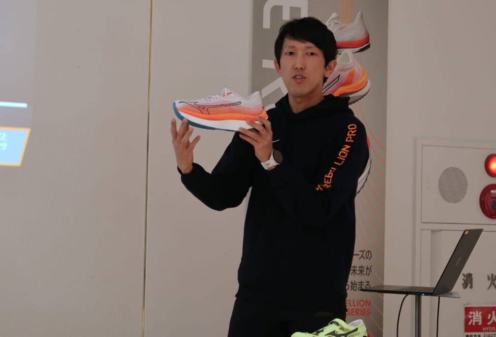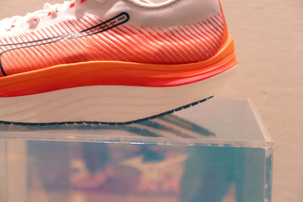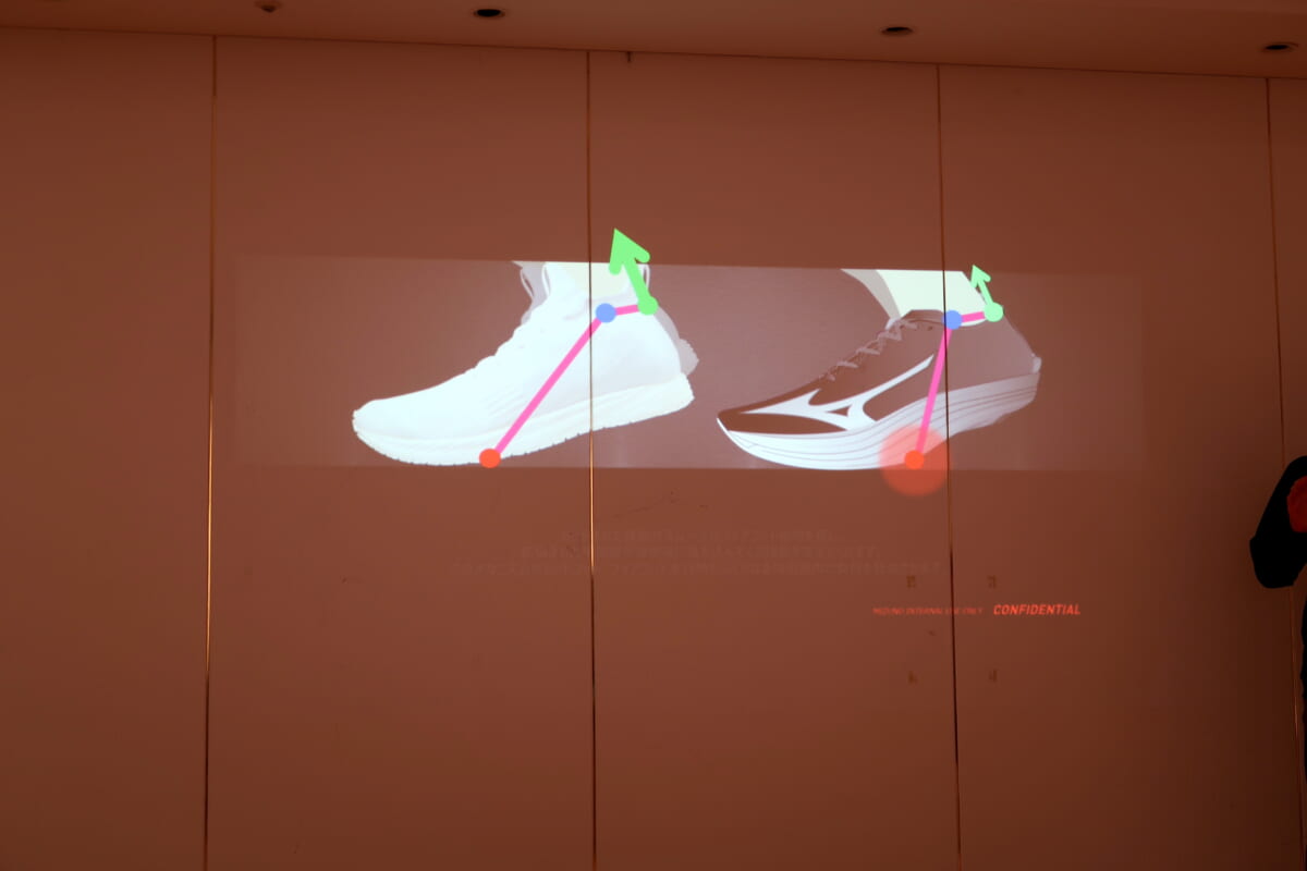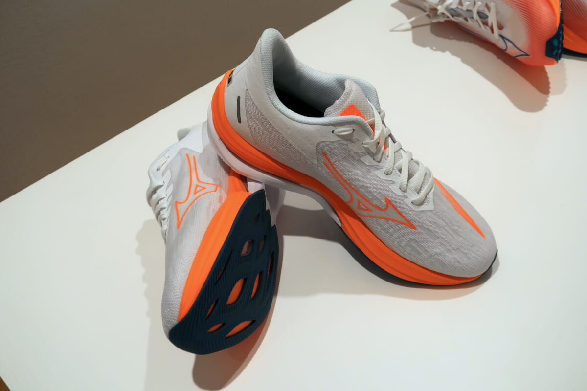 目がとまる独特の形状、カラーリングも爽やかなウエーブリベリオンプロを筆者が実際に履いてみると、自然と前傾姿勢になり推進力の高さが体感できます。また、見た目以上に軽く、クッション性の高さにも驚き。「人を最速で走らせるために、いかにスムーズなスピードランニングを考えるか」というプロジェクトを今後も続けるミズノが、現在の最新技術を凝縮させたランニングシューズ。