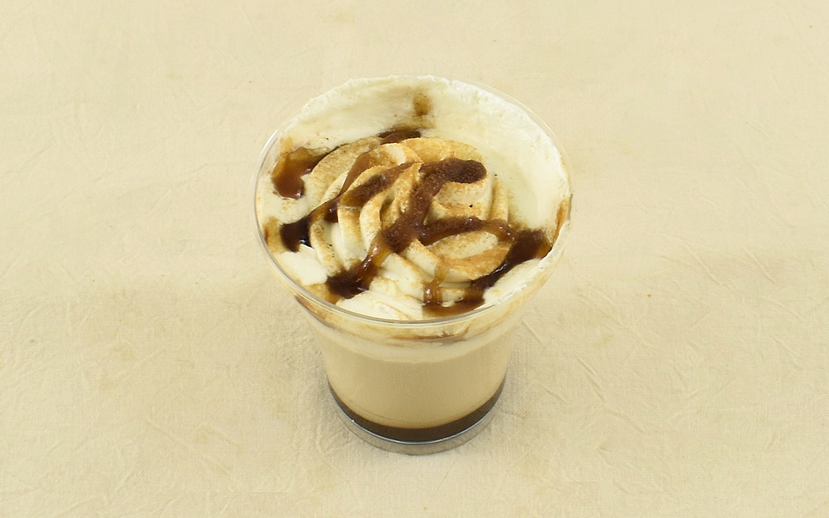 口に運んだのは上層のホイップクリーム。ふわっとした食感で乳製品特有の甘みが口の中に広がる一方、クドくなりすぎないように黒みつソースの苦味によってクセが抑えられています。黒みつに加えてきな粉も重なることで、いっそう“和”を感じさせる風味に。意外な組み合わせですが、「ホイップクリームと相性がいい」という発見にもつながりました。