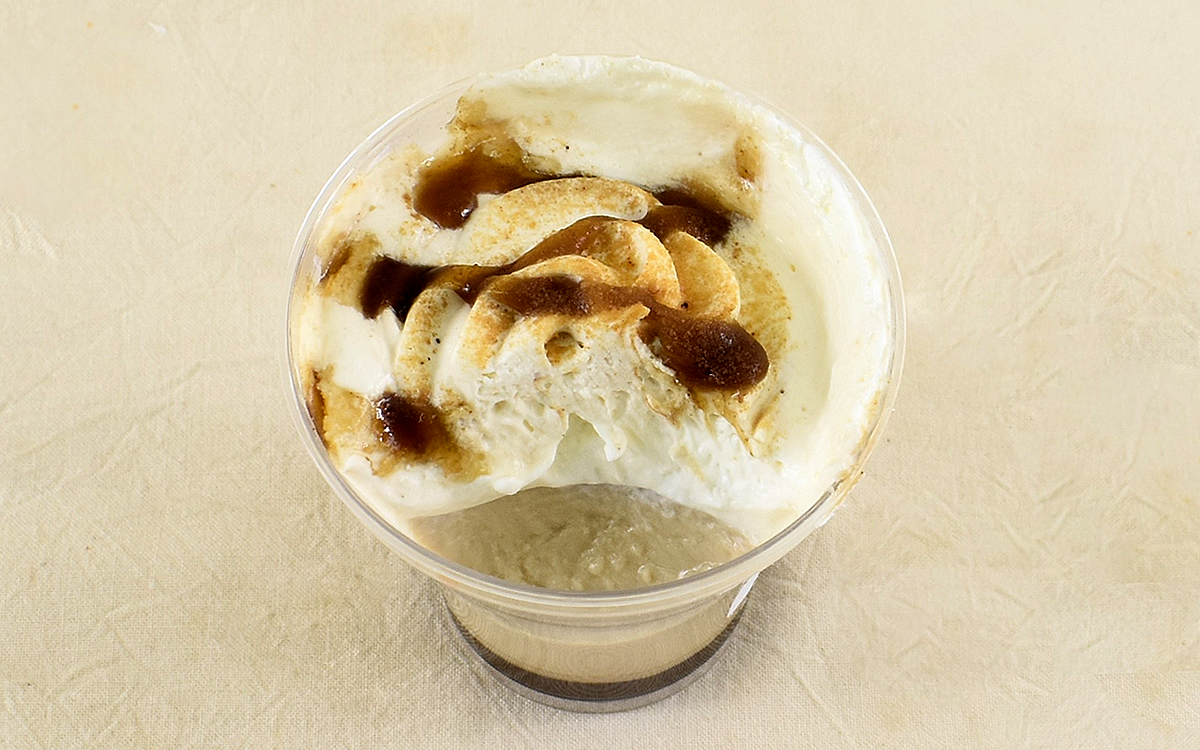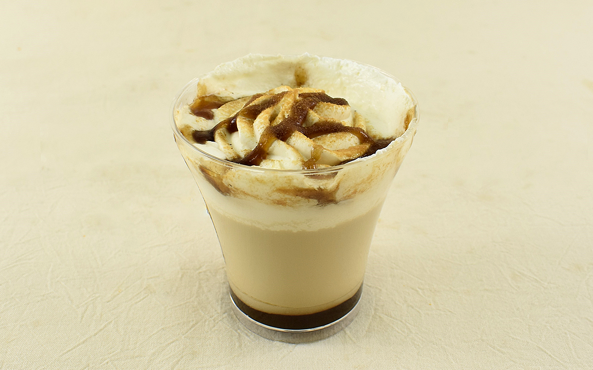 コンパクトなカップにぎゅっと中身が詰まった同商品。名称には含まれていませんが、黒みつとともにまぶされたきな粉が意外性を感じさせてくれます。またカップは小さくても、ホイップクリームや黒みつラテプリンがたっぷり。どのような味わいを楽しめるのか、さっそく「とろける黒みつラテプリン」をいただいていきましょう。