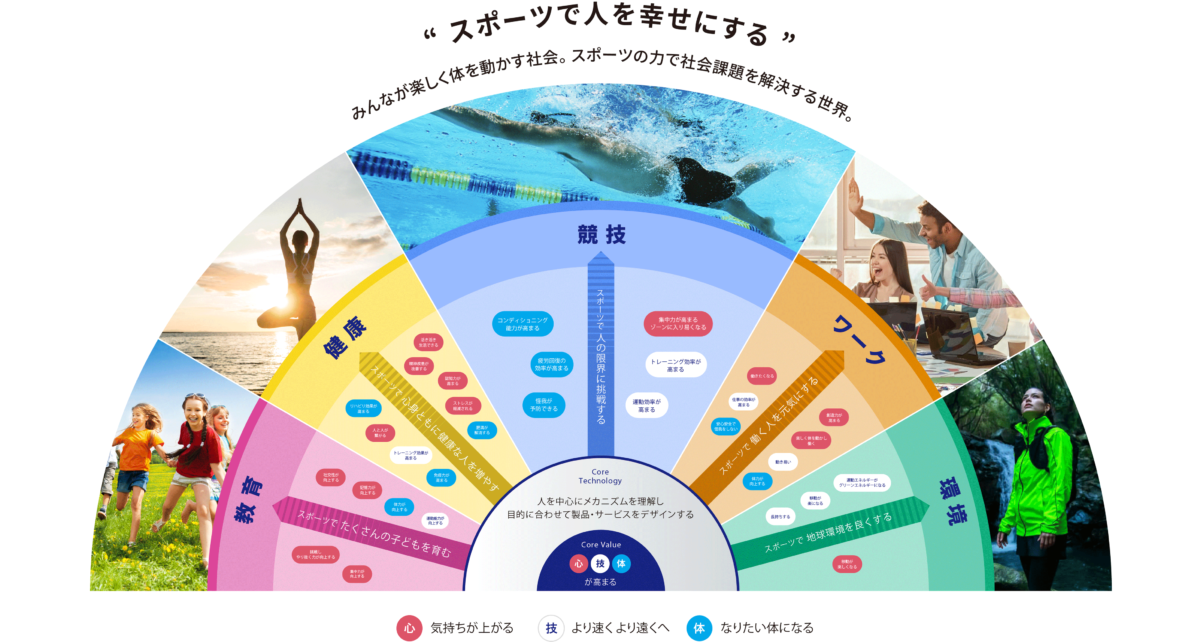 ミズノは、競技スポーツだけでなく、楽しく体を動かすことを“スポーツ”と定義している。MIZUNO ENGINEは、こうした広い意味でのスポーツで、人々を幸せにすることを目指す施設なのだ。それをひも解くのが、「ミズノミライビジョン」という5つの研究開発ビジョンだ。