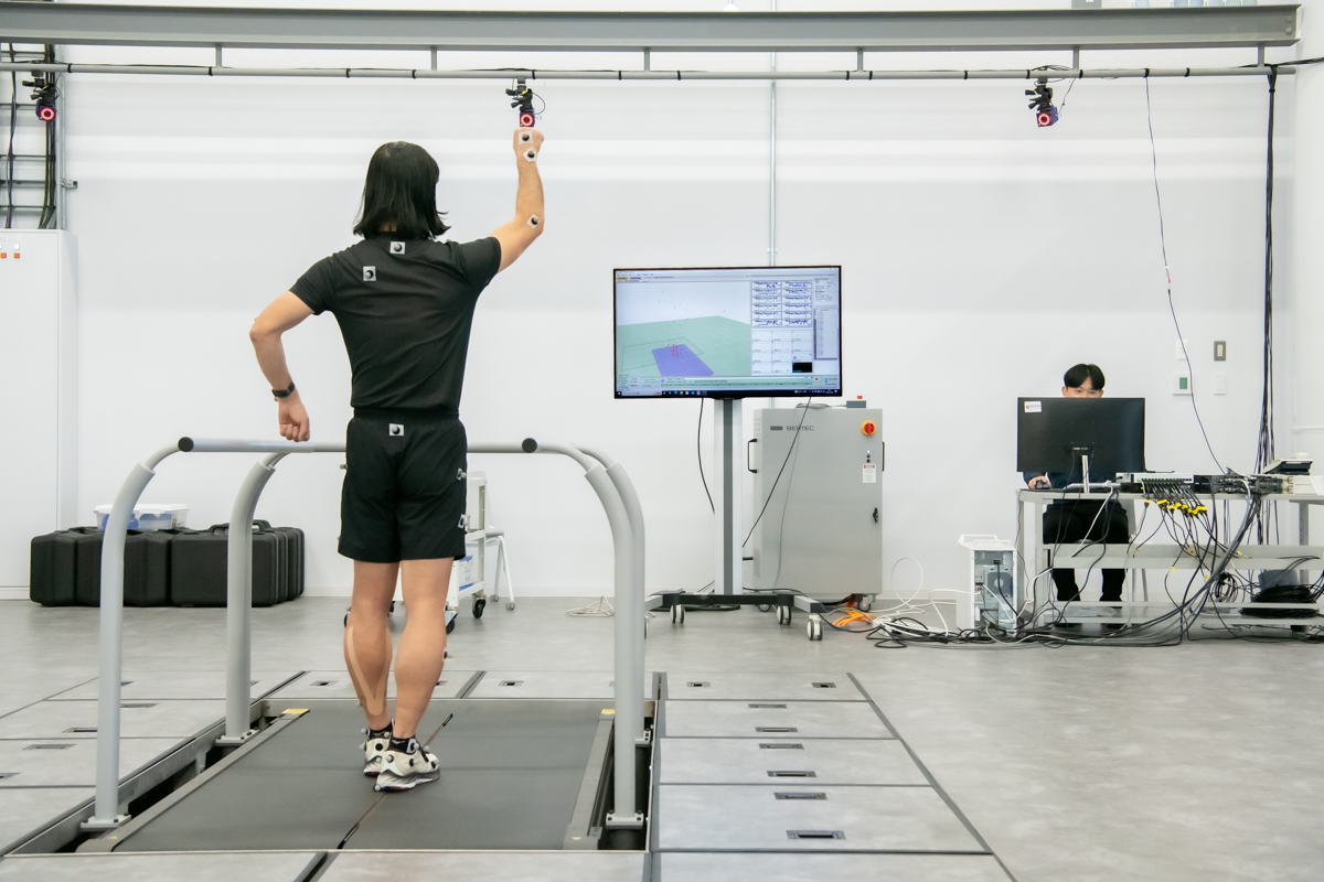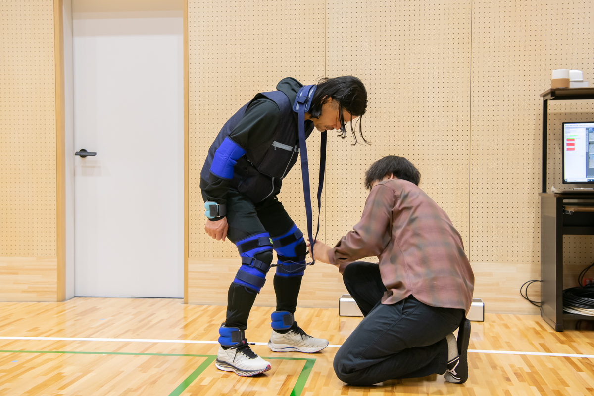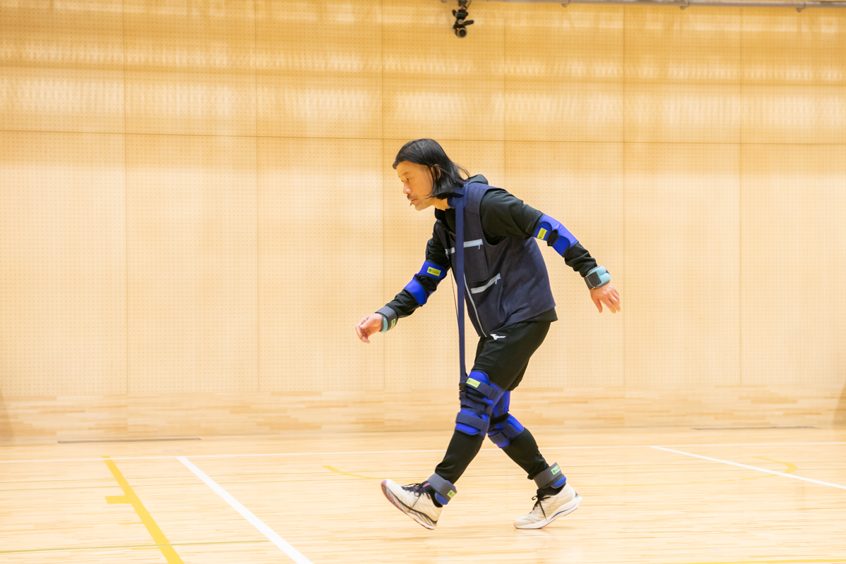 まずは、足腰が弱くなった、高齢者の状態を疑似体験! この時のカラダの使い方を、最新のマーカーレスモーションキャプチャーで撮影することとなった。マーカーレスモーションキャプチャーは、文字通り、カラダに取り付けるマーカーなしで、カラダの動きを三次元でデータ化できるシステムだ。計測を担当してくれるのは、ミズノの矢野勇貴さんである。