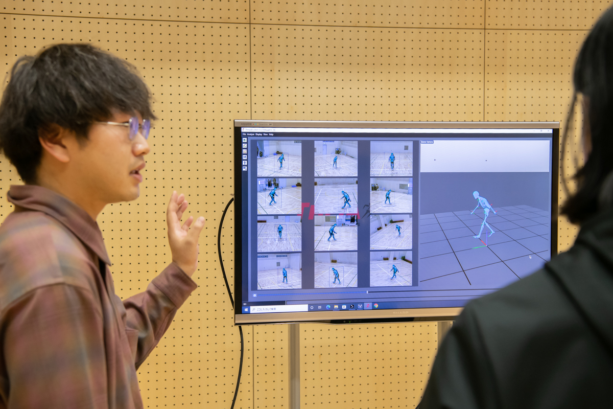 最後に訪れたのは、モーションキャプチャーのラボ。赤外線光のカメラ12台が、反射マーカーを付けたカラダの動きを360度で捉え、3Dとして解析を行うことができる。反射マーカーは最小4㎜の間隔まで検知できるため、足関節の骨や、顔の表情筋の動きも忠実にデータ化できるという。計測のご担当は、古川大輔さんである。