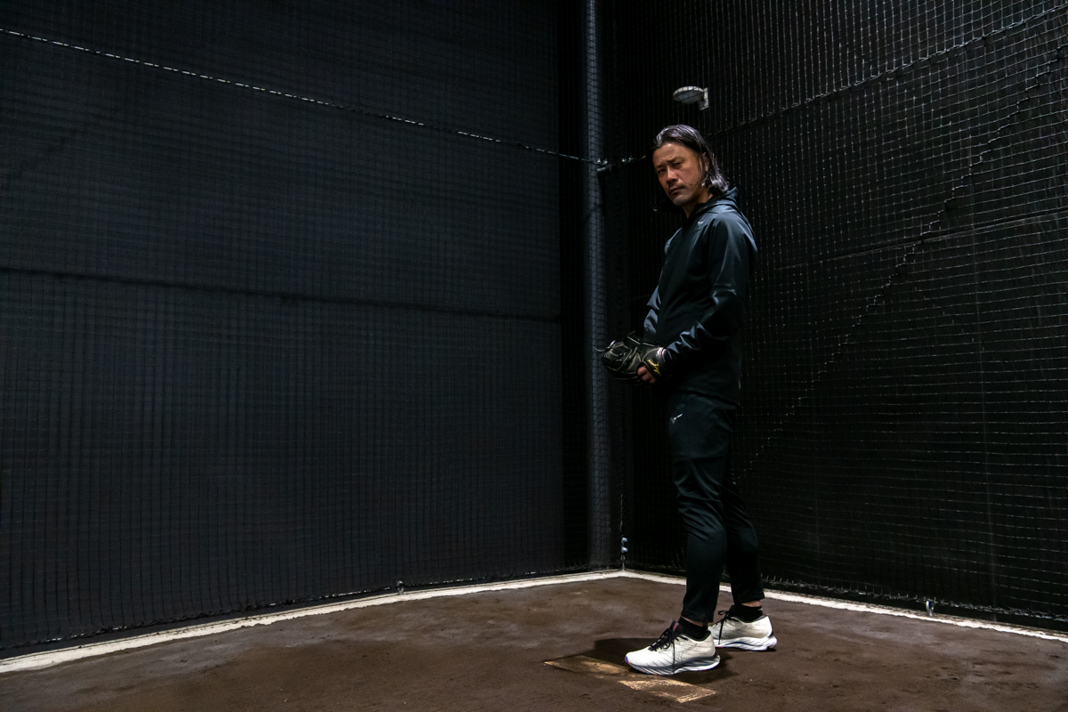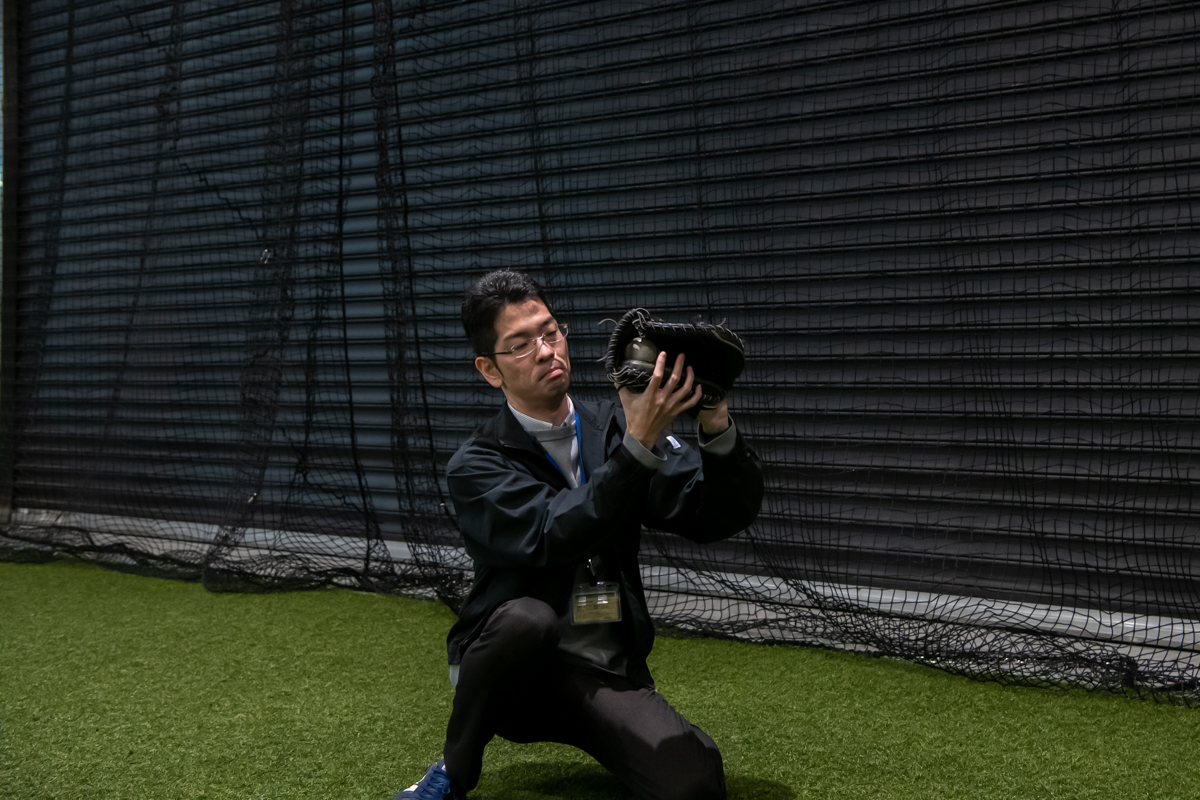 続いて訪れたのは、スポーツパフォーマンスラボという部屋。室内に用意された野球用のブルペンには甲子園と同じ土が盛られ、人工芝は西武ドームやナゴヤドームと同じモノが使われているという。筆者を待っていてくれたのは、ミズノの柴田翔平さんである。